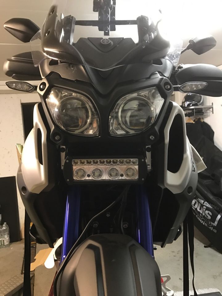 Ich hab mir, um besser sehen und gesehen werden, etwas vorgenommen: in der Mitte unter dem Hauptscheinwerfer ein Zusatzscheinwerfer mit TFL und dazu noch links und rechts einen Nebler. Der Scheinwerfer kommt noch etwas höher, so dass er dann mit dem Hauptscheinwerfer optisch zu einer Einheit wird. Auf dem Bild fehlt noch die Verkleidung um den Scheinwerfer.