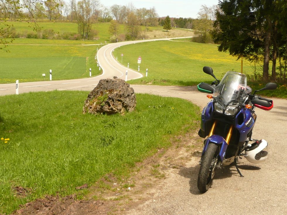 Heute an der Kreisstaße K7408 zwischen Westerheim und Feldstetten auf 805 m. Schade, 2 Min. zu früh auf den Knopf gedrückt, sonst - 12:55 - wäre eine vorbeifahrende dunkle FJR mit drauf. Tornanti gibt es auch vor der Haustür.