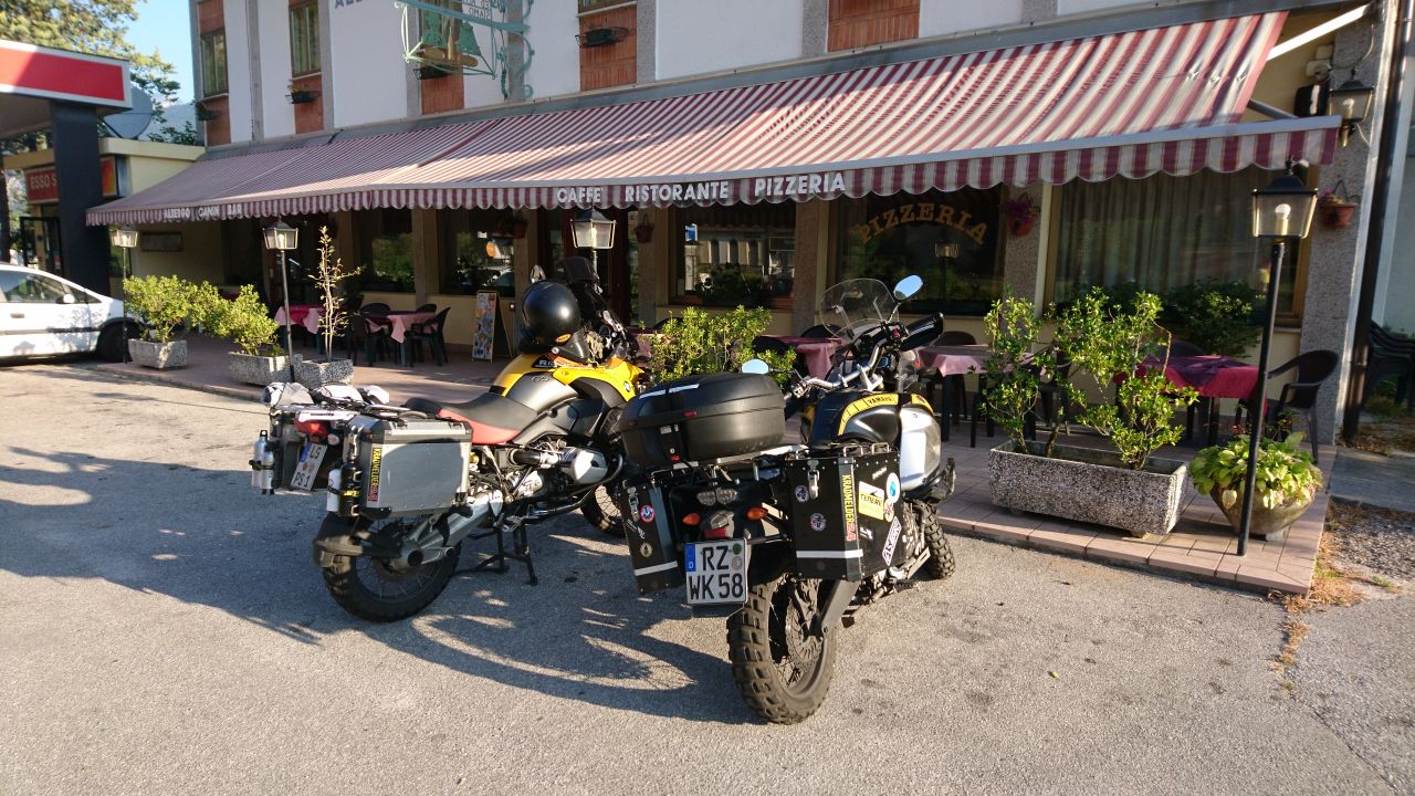 Leider war es nach dem Vrsic-Pass erst einmal vorbei mit den Bergen, wir mussten durch die slovenische Ebene fahren und hatten leider nach den vielen Tagen in den Bergen wieder recht viel Verkehr, andererseits ging es trotzdem einigermaßen zügig voran. Allerdings war es doch ziemlich warm, um die 30 Grad… Nach gefühlten fünf Stunden ging es zum Glück wieder in die Berge, zwar nur ähnlich wie der Schwarzwald aber besser als die Ebene und es wurde wieder etwas kühler, nur noch 25 Grad. Die letzten Kilometer nach Laska zogen sich dann doch, besonders weil wir wieder in der Ebene landeten. Dann noch durch die Stadt Celje, einmal tanken und dann nach Laska, direkt an der dortigen Brauerei vorbei zur Villa Monet, unserer Unterkunft für heute. Eine schön gemachte Villa mit ansprechendem Café und top ausgestatteten Zimmern, mitten in der Altstadt gelegen. Beim Einchecken gabs dann ein frisch gezapftes Laska in eisgekühlten Gläsern, so darf der Tag enden. Ich habe dann noch schnell eine Scheinwerferbirne gewechselt und dann gings unter die verdiente Dusche. Und nu wird gegessen!