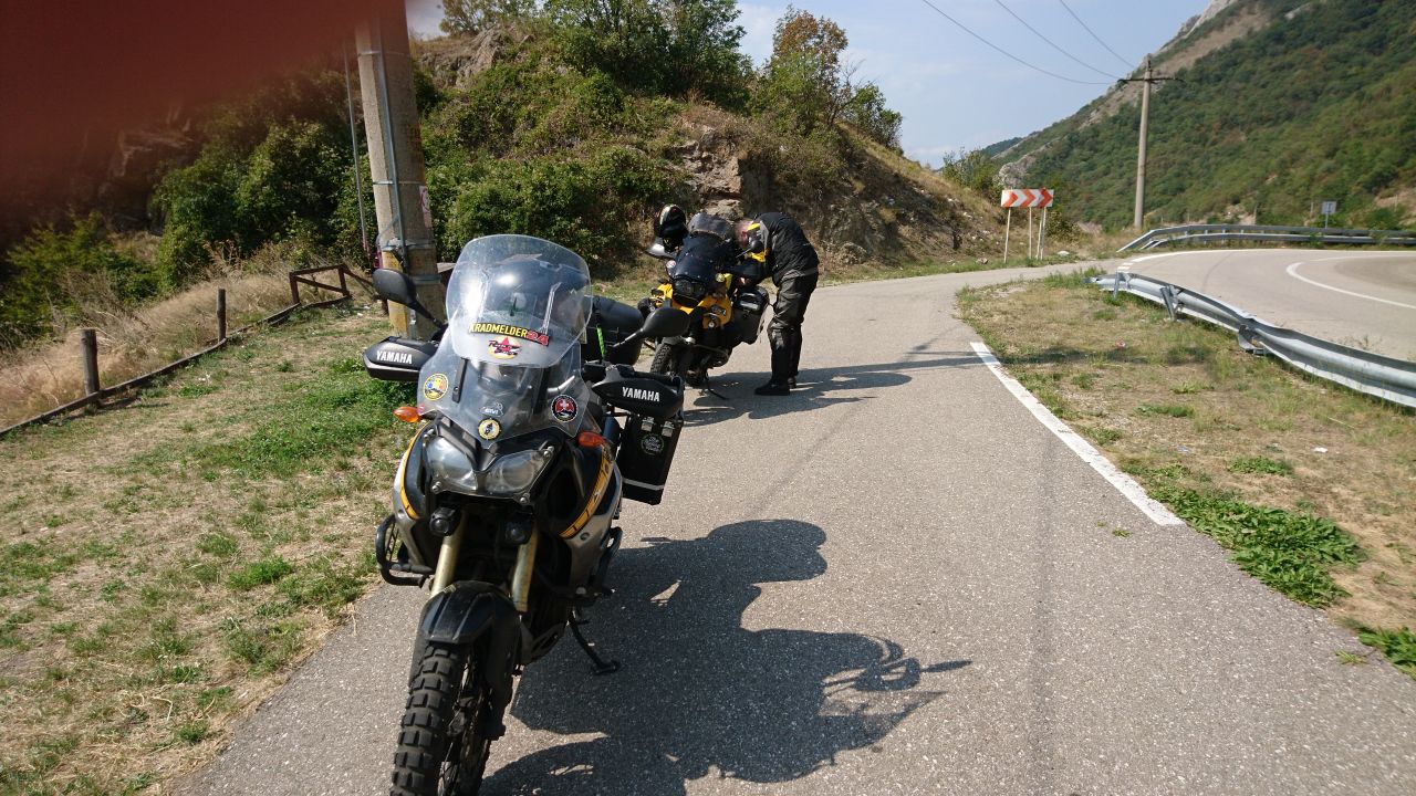 Doch genug gemeckert, rauf auf die Moppeds und los geht’s. Heute geht es zum Donaudurchbruch und dann nach Herkulesbad, wo wir einen Unterkunft vorgebucht haben. Zunächst geht es jedoch durch die Ebene nach Temeschwar und dann wird’s hügelig und wir machen Bekanntschaft mit den berüchtigten rumänischen Schlaglochpisten. Wer meinen Bericht Roads to Siberia kennt kann mit dem Begriff Straßentango was anfangen. Eine echt schlimme Straße, manchmal hatten wir die Wahl zwischen einem tiefen und einem ganz tiefen Schlagloch! Zum Glück war der Spuk nach ca.25 km vorbei. Bei einer kurzen Pause trafen wir dann noch auf eine Gruppe Moppedfahrer, die auch grad diese Strecke hinter sich gebracht hatten. Zwei Goldwings waren dabei, die muss es schwer gebeutelt haben.