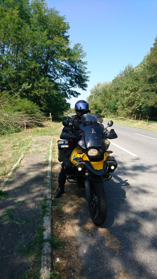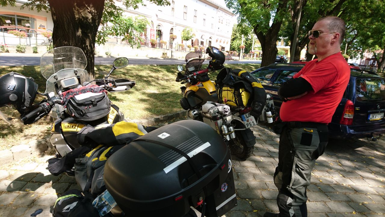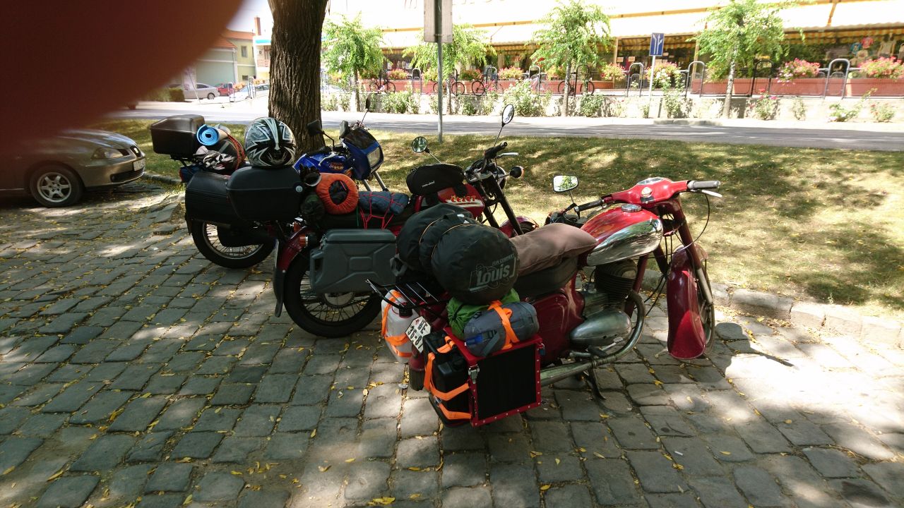 Die Fähre war dann auch wie bestellt bereit als wir das Frühstück beendet hatten. Der Fährmann hat uns dann für die Moppeds und Fahrer 15€ abgeknöpft, kein Schnäppchen aber besser als zu schwimmen oder um den ganzen See herum zu fahren. Danach gings dann wieder durch die pannonische Tiefebene bei freundlichen 35 – 38 Grad… Zum Glück waren die Straßen weitgehend leer, so dass wir gut Strecke machen konnten, immerhin standen heute 420 km auf dem Zettel. Gegen Mittag haben wir dann die Donau überquert und ein kurzes Päuschen auf dem baumbestandenem Markplatz von Dunaföldvar eingelegt. Zum Essen war es viel zu warm, also haben wir nur getrunken und uns etwas die Beine vertreten. Während der Pause kamen noch ein paar Tschechen auf alten öltropfenden Jawas an und haben ihre Zweitakter neben uns abgestellt. Es waren recht junge Burschen, vielleicht so um die 20 und auf dem Rückweg von Rumänien.