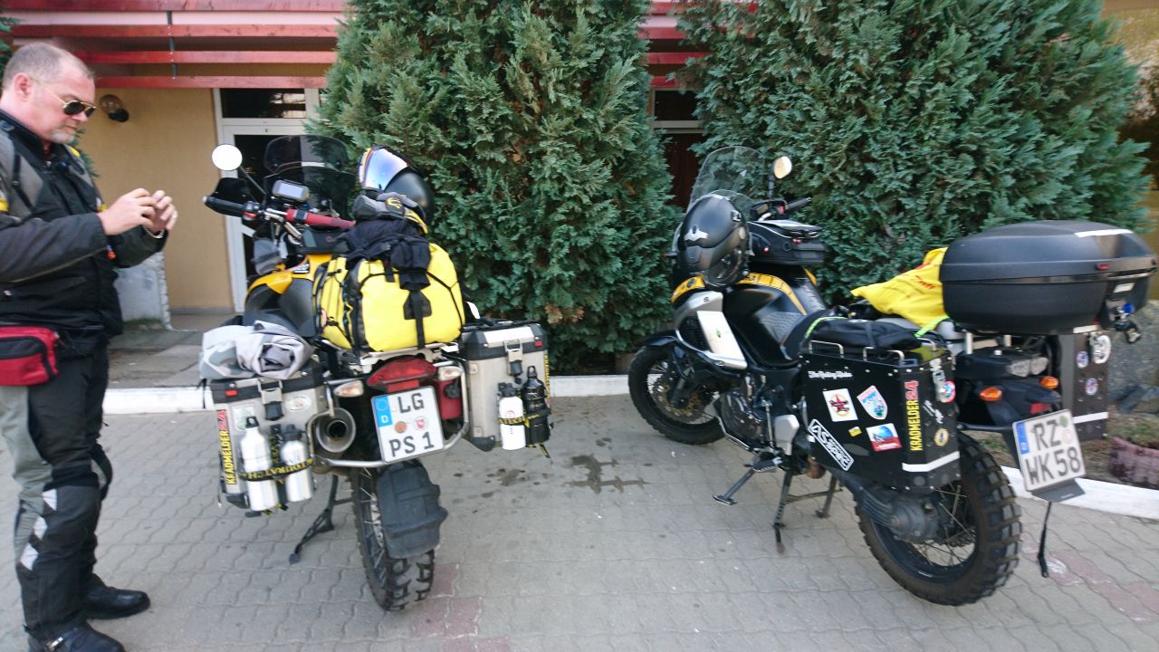 Der Tag begann für mich früh, es plätscherte draußen, als wenn es hagelt. Also schnell aufstehen und gucken was los ist, es war nur ein Schauer, aber die Tropfen fielen auf ein Blechdach, daher der Lärm. Beim Blick auf die Uhr stellte ich dann fest, dass es eh Zeit zum Aufstehen war, sprich es war kurz nach sieben. Da es eh kein Frühstück gab bin ich erst mal raus um nach dem Wetter zu gucken. Vom Regen war schon nichts mehr zu sehen, alles war schon wieder trocken, aber immerhin auch etwas kühler als gestern. Immerhin gab es Kaffee, dazu aus dem Tankstellenshop ein Tütenhörnchen und dann schnell packen und aufrödeln. Unterm Strich war die Unterkunft ein Fehlgriff! Also, wer durch Biled in Rumänien kommt sollte nicht das dortige Motel Angellis nehmen. Entweder einen Ort vorher das Schwabenhaus nehmen oder 20 km weiter fahren zur nächsten Unterkunft.
