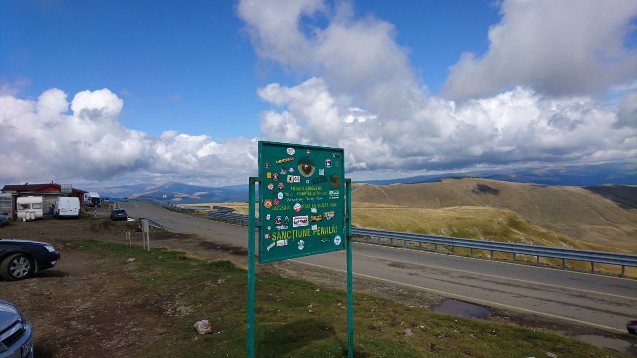 Der weitere Anstieg verlief dann weiterhin so spektakulär wie gehabt. Als wir den Bereich mit den vielfach geschwungenen Kehren erreichten war es leider mit der Sicht so gut wie vorbei. Wir fuhren quasi in die Wolken hinein und die Sicht reduzierte sich fast auf null. Naja, es waren so knapp 20 m, die man gucken konnte. Damit war zumindest erst einmal der Spaß vorbei, denn dieser halbe Blindflug forderte alle Aufmerksamkeit. Wirklich schade, aber so ist es in den Bergen. Dafür hatten wir gestern auf der Transalpina bestes Wetter. Auf der Passhöhe war trotz des Wetters einiges los. Etliche Souvenirbuden, dazu ein kostenpflichtiger Parkplatz und auch diverse Buden mit Essen und Trinken „verzierten“ den Pass. Wir hielten kurz an, um unseren Sticker zu platzieren und fuhren dann weiter. Am Tunneleingang legte Peter (Fritze) eine Vollbremsung hin, weil er plötzlich null Sicht hatte. Die Wolken sind ein Stück weit in den Tunnel getrieben und haben das Licht „ausgemacht“. Nach ein paar Metern ging es dann, man konnte einigermaßen gucken und zum Glück war es nicht der Anzob-Tunnel. Auf der anderen Seite des Passes war dann auch die Sicht besser, da die Wolken nicht so schnell über den Pass kamen. Zwar war die Straße immer noch feucht, aber so konnten wir dann relativ entspannt ins Tal rollen. In Sachen Straßenbau spielen die Rumänen in der gleichen Liga wie die Italiener! Der Abstieg ging auch nicht so steil hinunter wie auf der anderen Seite. Die Straß3e war zügig zu fahren und nachdem wir etwa 1000 m abgestiegen waren wurde es wärmer und die Sonne kam durch. Dazu wurde die Straße richtig gut, eben wie für Motorräder gebaut. Kurve an Kurve, über etliche Kilometer an einem Stausee vorbei, ein nicht enden wollender Kurvenrausch. Als wir auf einen Sprinter aufliefen nahmen wir ein Kaffee zum Anlass für eine Pause, sprich Kaffee, Cola, Zigarette und ein paar dieser Tüten-Croissants. Kurz bevor wir wieder los wollten traf noch ein älteres Pärchen aus England ein. Sie waren auf einer 700GS unterwegs. Ein kurzer Plausch und dann ging es mit „have a safe journey“ weiter den Kurven hinterher. Über Domnesti ging es kurvig weiter zur DN73 und wir steckten wieder voll im Verkehr. Auf diesen DN (Drum Nationale) läuft der meiste Verkehr in Nord-Südrichtung und demensprechend waren viele LKW unterwegs. Auf Grund der vielen Ortschaften und der Kurven war überholen schwierig. Doch Fritze hatte zum Glück eine Art Abkürzung entdeckt, nämlich bei Podu Dambovitei in die DC 22 abbiegen und durch die Dambovita Klamm fahren. Ein wunderschönes, meist einspuriges Sträßchen klettert in die Höhe, mit engen Kehren und toller Landschaft bis zum Ende des Asphalts und zu einem Feldweg. Was die Navis nicht wissen ist nämlich, dass nach gut 500 m der Feldweg zur DJ112G wird und wieder zurück auf die DN73 nach Brazov führt. Unterm Strich haben wir damit gut 40 km DN73 gegen 20 km tollste Strecke eingetauscht. Am Ende der kleinen Straße haben wir noch eine Pause gemacht und den herrlichen Ausblick genossen. Es zeigte sich eine wunderschöne Almlandschaft wie man sie auch aus den Alpen kennt. Einfach toll so ein Ausblick.