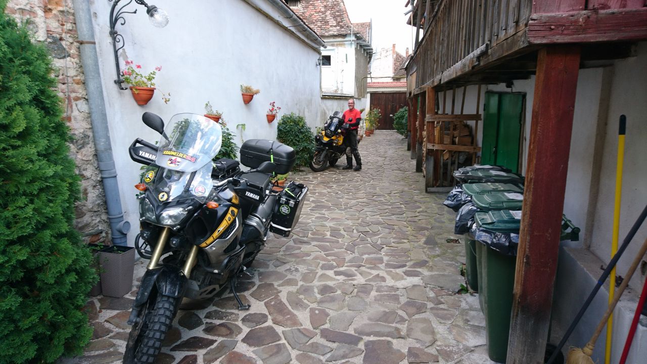 Nach vielleicht 3-4 Kilometern wurden wir dann von einem Posten wieder auf unsere Spur gewunken und in eine Lücke dirigiert, in der schon vier holländische Moppedfahrer warteten. Also kurz eingereiht und dann gemeinsam gewartet, ob und wie es weitergeht. Wir kurz miteinander gesprochen und stellten fest, alle wollen nach Sibiu. Dann kam der Posten und machte uns klar, dass es jeden Moment losgehen könne. Also rauf auf die Moppeds und auf das Startsignal warten. Leider mussten wir dann doch die ersten 2 Kilometer so lang war der Stau auf der Gegenseite) hinter dem Laster bleiben. Dann war freie Bahn und dank der jetzt freien und gut ausgebauten gings jetzt mit 6 Moppeds im Formationsflug zügig über die Landstraße. Kurz vor Sibiu mussten wir dann einer Umleitung folgen, was aber nicht weiter dramatisch war, die Straße war schön kurvig und ging die Hügel rauf und runter. Dann kamen wir nach Sibiu rein. Für hiesige Verhältnisse (soweit wir das Land erfahren haben) fast eine Großstadt und im Gegenteil zu Vulcan deutlich aufgeräumter und gepflegter. Die Außenbezirke wirkten keineswegs ärmlich oder heruntergekommen, sondern hätten in jede europäische Stadt gepasst. Allerdings war die Verkehrsführung etwas gewöhnungsbedürftig, bei einem Doppelkreisel fiel Peters Navi aus und er verlor die Orientierung. Aber ein Neustart half und ab gings zu unserer Pension in der Altstadt. Von der Straße waren nur ein Tor und das Schild zu sehen. Einmal klingeln und die kleine Personenpforte ging auf und zeigte einen schnuckeligen kleine Hinterhof, von wo aus die einzelnen Zimmer und die Rezeption abgingen. Nach dem Einchecken öffneten wir das ganz Tor und rollten mit den Moppeds auf den Hof. Feierabend! Nun schnell duschen und dann ab zum Essen in die Altstadt! Vorher habe ich noch mal einen Bankomaten überfallen, hat gut geklappt und ich brauchte nicht mal auf Neun Millimeter hinweisen…
