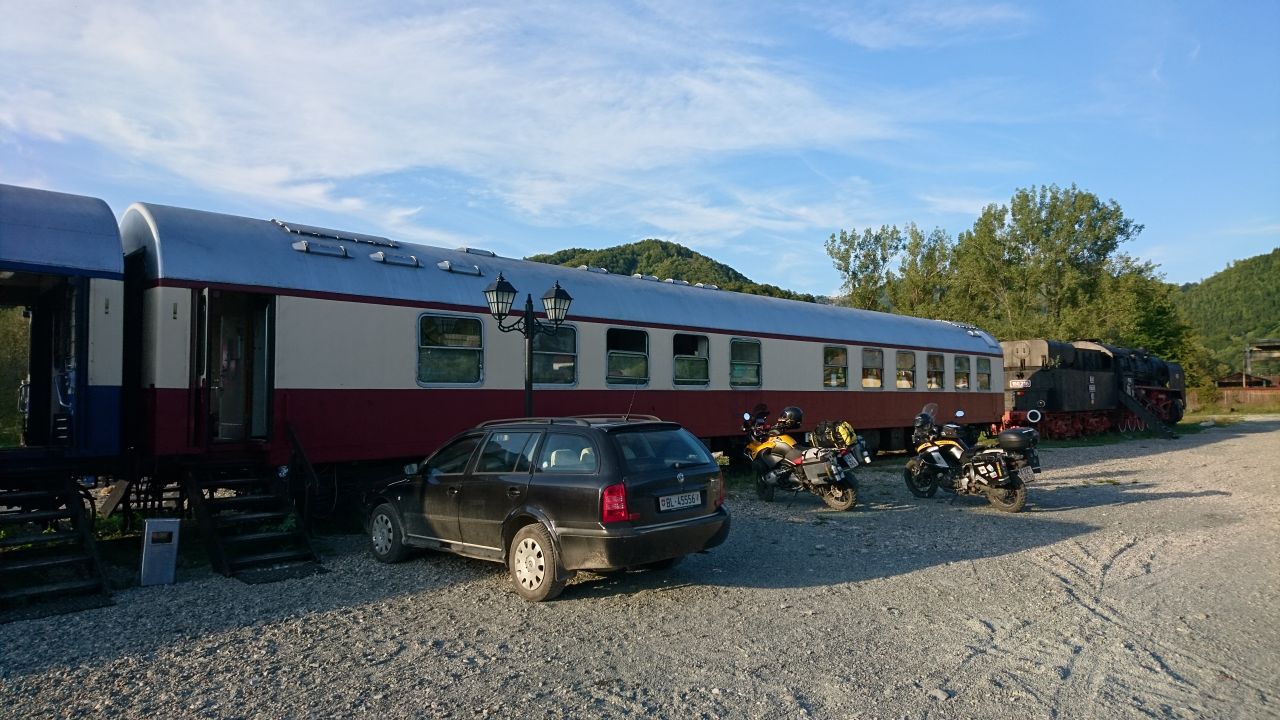 In Viseu de Sus gings dann zum Bahnhof, wo sowohl die Wassertalbahn als auch der Karpatenexpress auf uns warteten. Die Anlage oder besser das „Museum“ ist gut gemacht und wirklich einen Besuch wert. Als wir unsere Moppeds vorm Zug geparkt haben wurden wir gleich auf Deutsch begrüßt, es war Brigitte, die Chefin vom Speisewagen und sowas wie die Seele vons Ganze. Sie schickte uns zur Rezeption im Bahnhofsgebäude, wo wir eincheckten und uns gleich Tickets für die morgige Zugfahrt besorgten. Danach gabs dann die Einweisung für den Karpatenexpress. Unser Schlafwagen war ein typischer Schlafwagen aus ehemaliger DDR-Produktion. Jeder von uns hatte sein eigenes Abteil, mit zwei Kojen und ein wenig Stauraum. Es wirkte sehr gemütlich und auch der Speisewagen, wo es das Abendmenü und das Frühstück gibt war gemütlich, eben old style und nicht so kalt wie bei den heutigen Zügen. Da sich das Ganze auf dem abgeteilten Bahnhofsgelände befindet und bewacht wird brauchte man sich auch keine Gedanken wegen des Parkens machen.