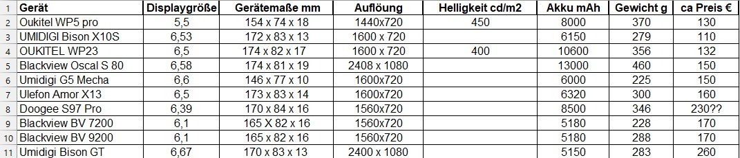 Nicos Beitrag hat mich richtig heißgemacht. Ich habe mir ein Tablet aus Pappe gebastelt und an die XT gehalten und mich stundenlang in den Weiten des Internets verloren um Geräte zu vergleichen. Meine letztendliche Entscheidung gegen ein Tablet hat einen sehr persönlichen Grund: Ich bin in der Regel alleine auf Tour, und nehme bei Stopps unterwegs (z.B. beim Einkaufen) immer das Smartphone aus der Halterung und stecke es in die Tasche. Das ist mit dem 8 Zoll Tablet naturgemäß schwierig. Ich habe mich entschieden auf ein größeres/seniorengerechteres Handy umzusteigen. Zum Vergleich habe ich mir eine kleine Marktübersicht erstellt, die ich hier anhänge, Mein neues Gerät ist ein Blackview Oscal S80. Auf dem Foto sieht man den Unterschied zum bisherigen Gerät, dem Oukitel WP5.