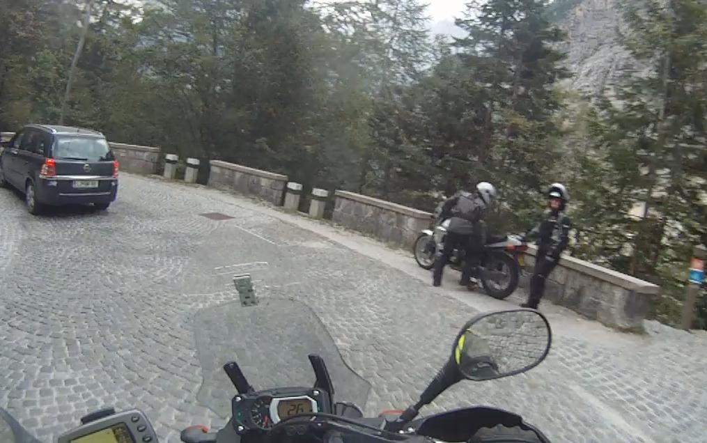 Zwei Kehren vorher hat ein BMW-Fahrer versucht seine Maschine rückwärts bergauf auf den Hauptständer stellen: