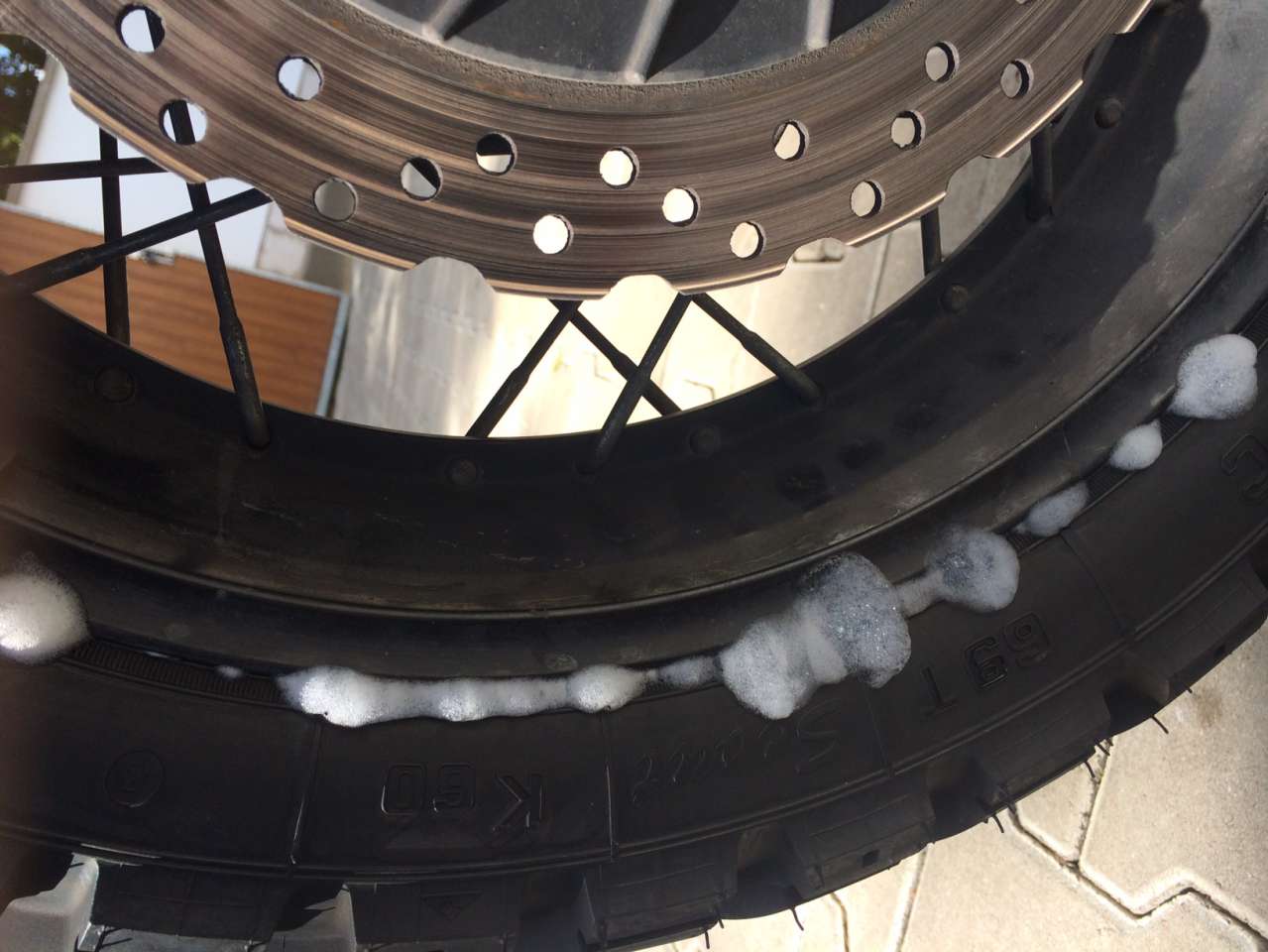 Gute Reifenhändler haben Lecksuchspray, zur Not geht auch Spüliwasser.