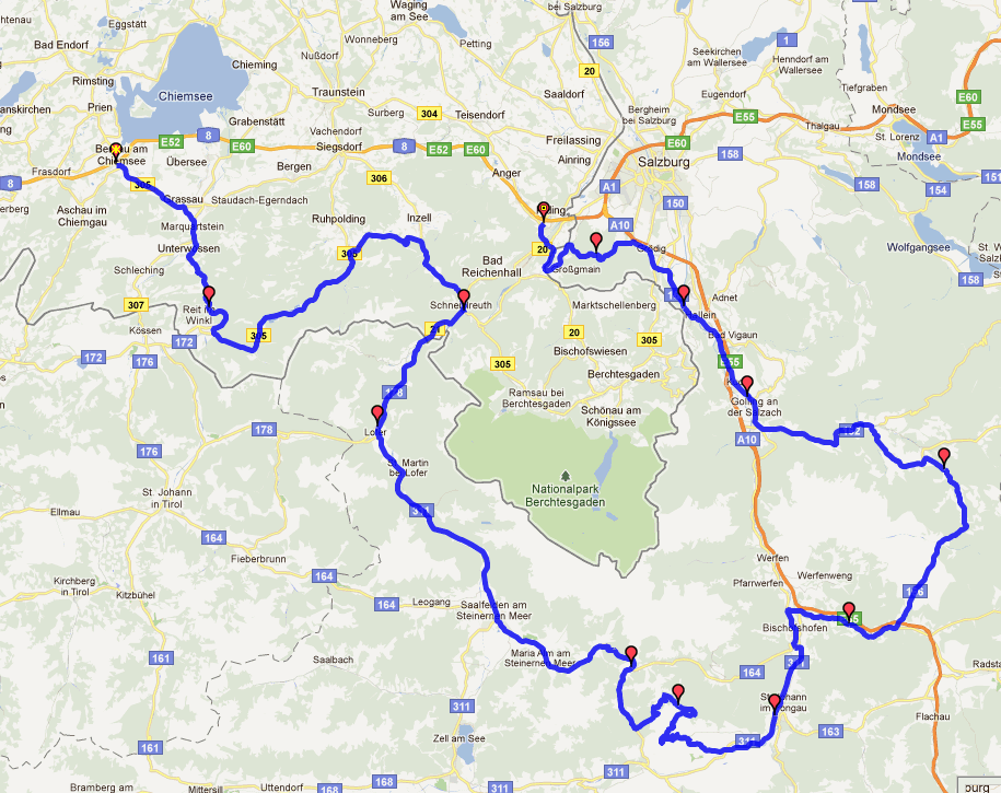 Anbei mal ein vorläufiger Routenvorschlag. Weil ich die Hochkönigstraße in den letzten drei Wochen dreimal gefahren bin, habe ich vom Dientner Sattel runter mal ein kleines Sträßchen angeklickt, keine Ahnung, ob man das (noch) fahren kann. Wenn nicht, geht es halt über die Bundesstraße.
