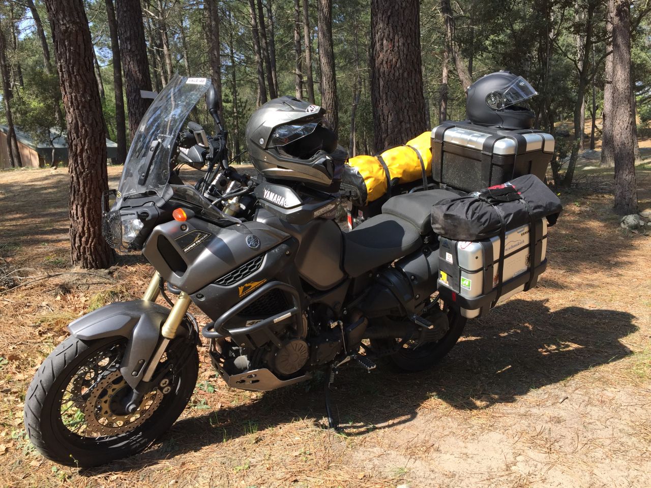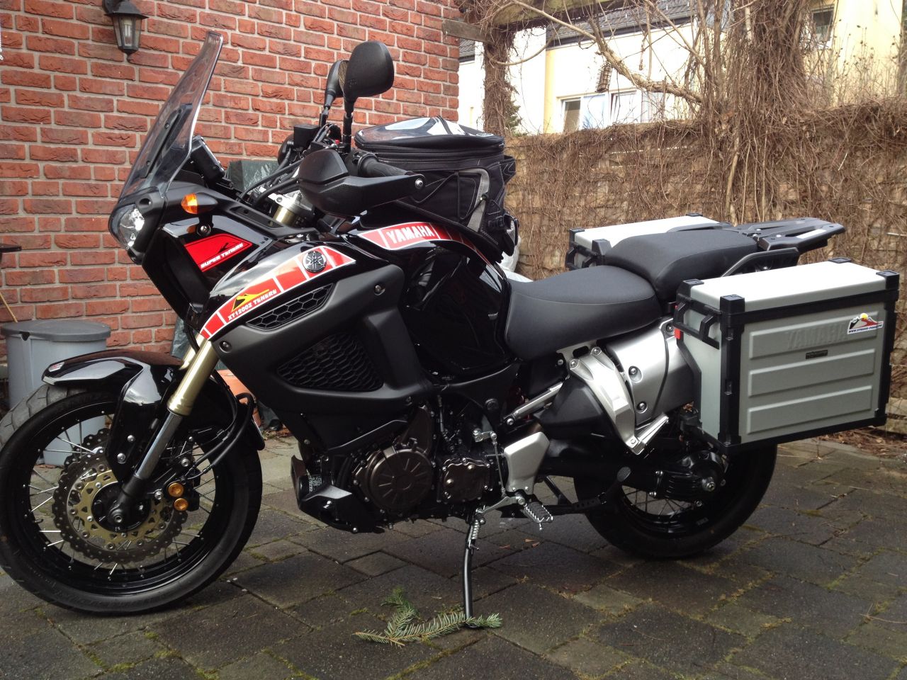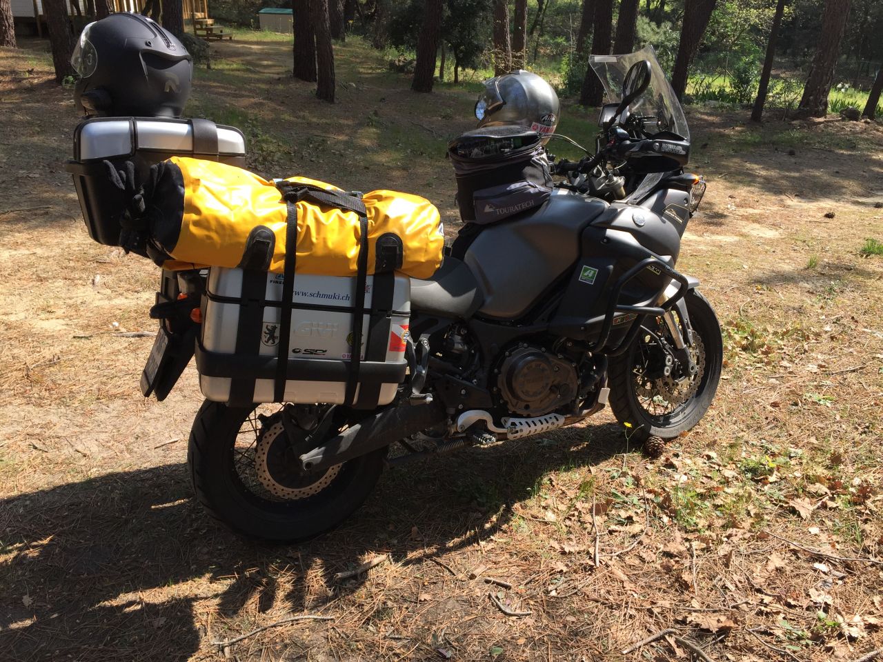 Die Taschenvariante ist für mich ideal, die Größe der Taschen ist durch den "Rollmechanismus" oben sehr variabel und die Taschen sind leicht und schnell ab- und anzuhängen. Auch die Breite kann man variieren, es ist so eine Art U als Kunststoffplatte eingelegt, die man durch die obere Zurgurte zusammenziehen kann und damit das Ganze etwas schmaler machen kann. Ohne Taschen sieht der Halter noch erträglich aus am Möpp (siehe Arrow Auspuff Fred)Snobby hat geschrieben: Mi 5. Apr 2017, 22:49 Warum hast du dich für diese Variante entschieden?