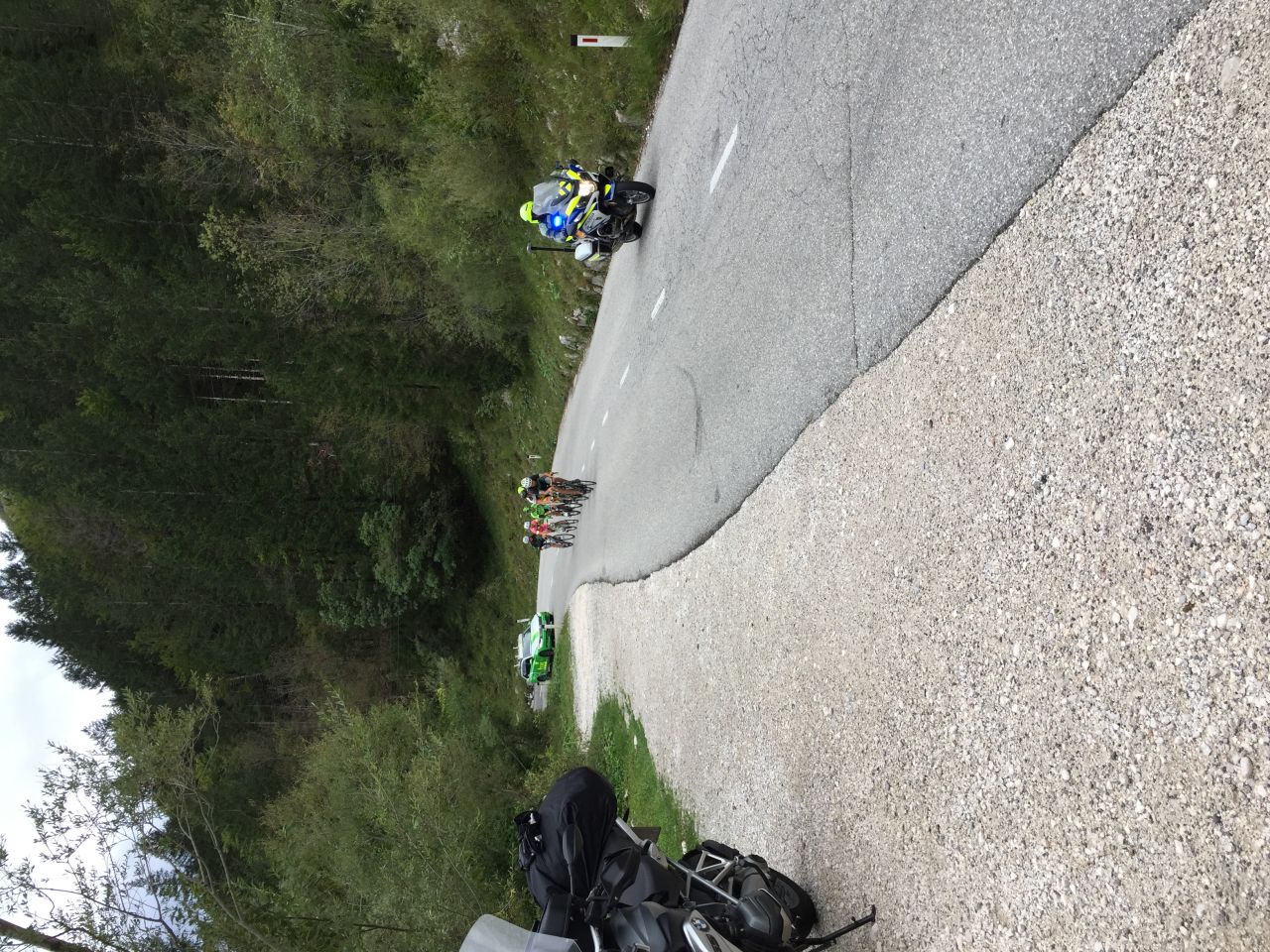 Wir sind auf einer Strecke gefahren die für ein Radrennen gesperrt wurde. Die Polizisten haben uns gezeigt wie schnell sie mit ihren Maschinen unterwegs seien können, was uns natürlich nicht störte.