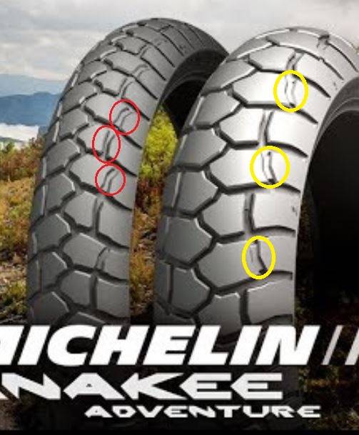 Was ich auch nicht nachvollziehen kann, sind die unterschiedlichen Profiltiefen am Hinterreifen. Ist man bei den gelben Kreisen unter 1,6mm hat man bestimmt Freude mit der Ordnungsmacht (deshalb vermutlich auch der Name: Adventure).
