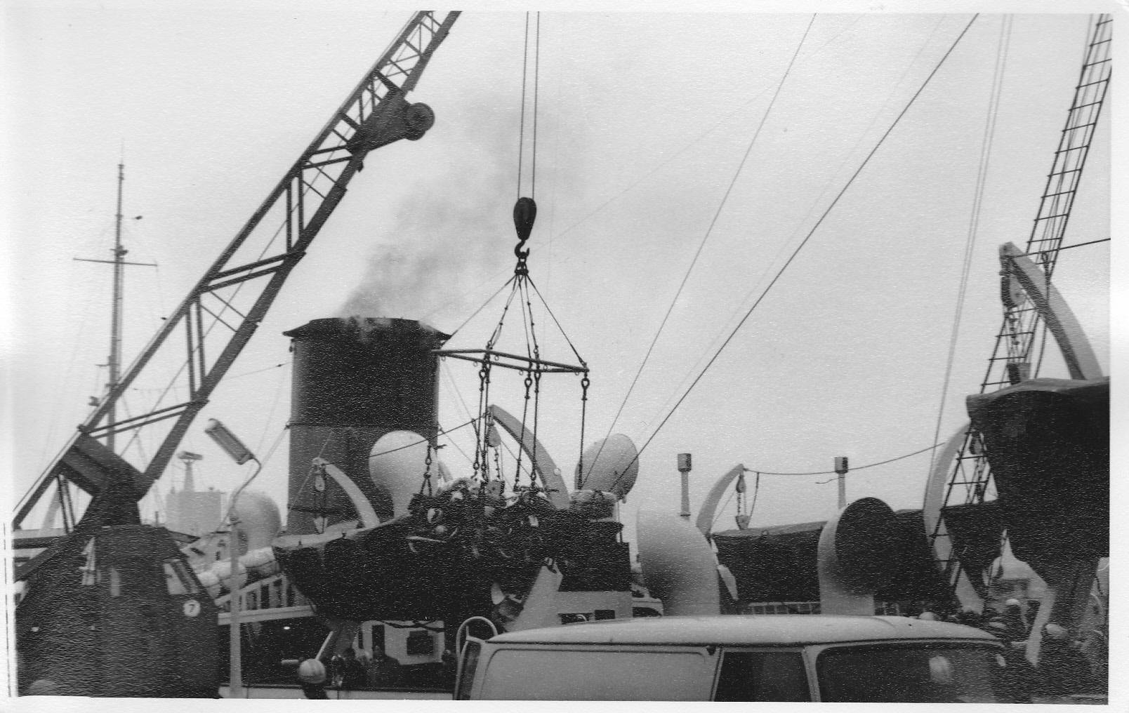 Die Verladung von bzw. zur Fähre erfolgte in Douglas mit jeweils drei Moppeds an einem Krangestell. Das war recht urig.