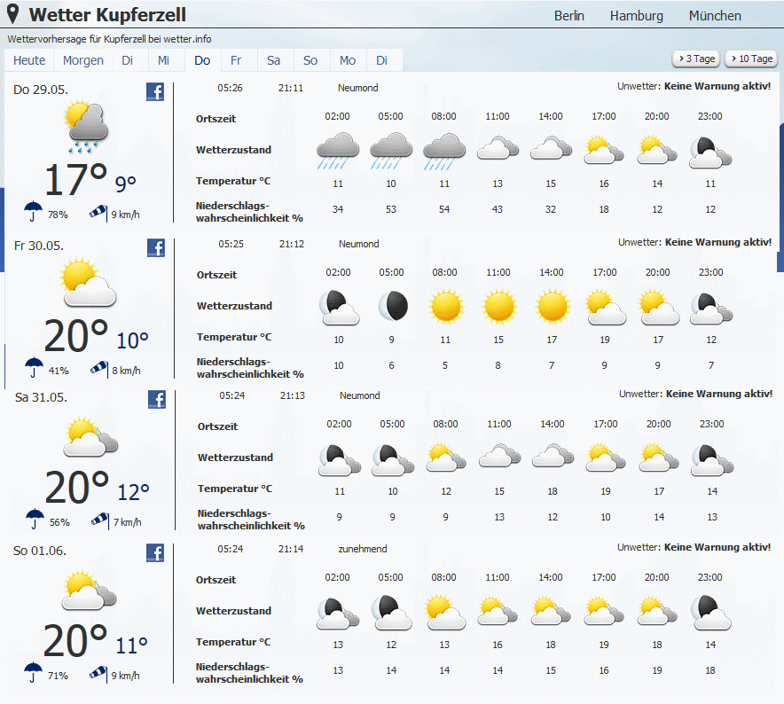 Leute, macht Euch mal keine Sorgen. Wir haben nicht nur die Touren, sondern auch das Wetter festgelegt ;) und schon bei wetter.info (dem einzig wahren Wetterdienst :!: :? ) eintragen lassen. Für Donnerstag haben wir vormittags noch ein paar Tröpfchen eingeplant - gerade so viel, dass man am Abend was zum Prahlen hat, wie toll man die Anreise gemeistert hat. Für Freitag bis Sonntag haben wir uns dann für angenehmes Motorradwetter entschieden :bewoelkt: :sonne: . Wer diesen Plan durch öffentliches Anzweifeln sabotiert, erklärt sich damit bereit, die dann fällige Kompensations-Lokalrunde am Abend :bier: zu übernehmen :mrgreen: .
