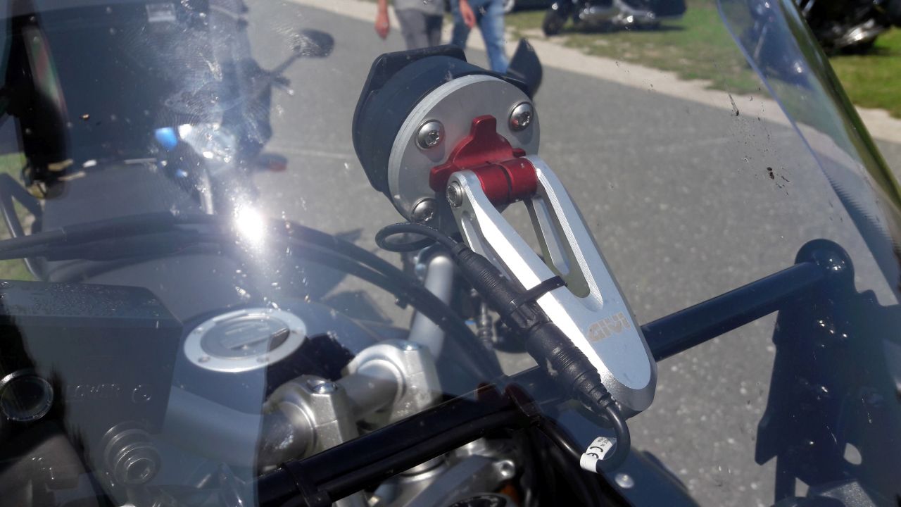 Die Vibrationen wegzumachen ist nicht einfach. Das ganze hängt schon an gummigelagerten Schrauben, mit denen der Scheibenversteller am (etwas biegsamen) Geweih aufgehängt ist. Damit übertragen sich alle Scheiben- und Motorradbewegungen schließlich verstärkt bis zum Navi. Die einzige wirklich taugliche Lösung hat jemand auf dem amerikanischen Forum praktiziert: Er hat Diagonalstreben zwischen Scheibenversteller und den Anbaulöchern der Windabweiser verbaut. Sieht schrecklich aus, ist aber wohl wirksam.