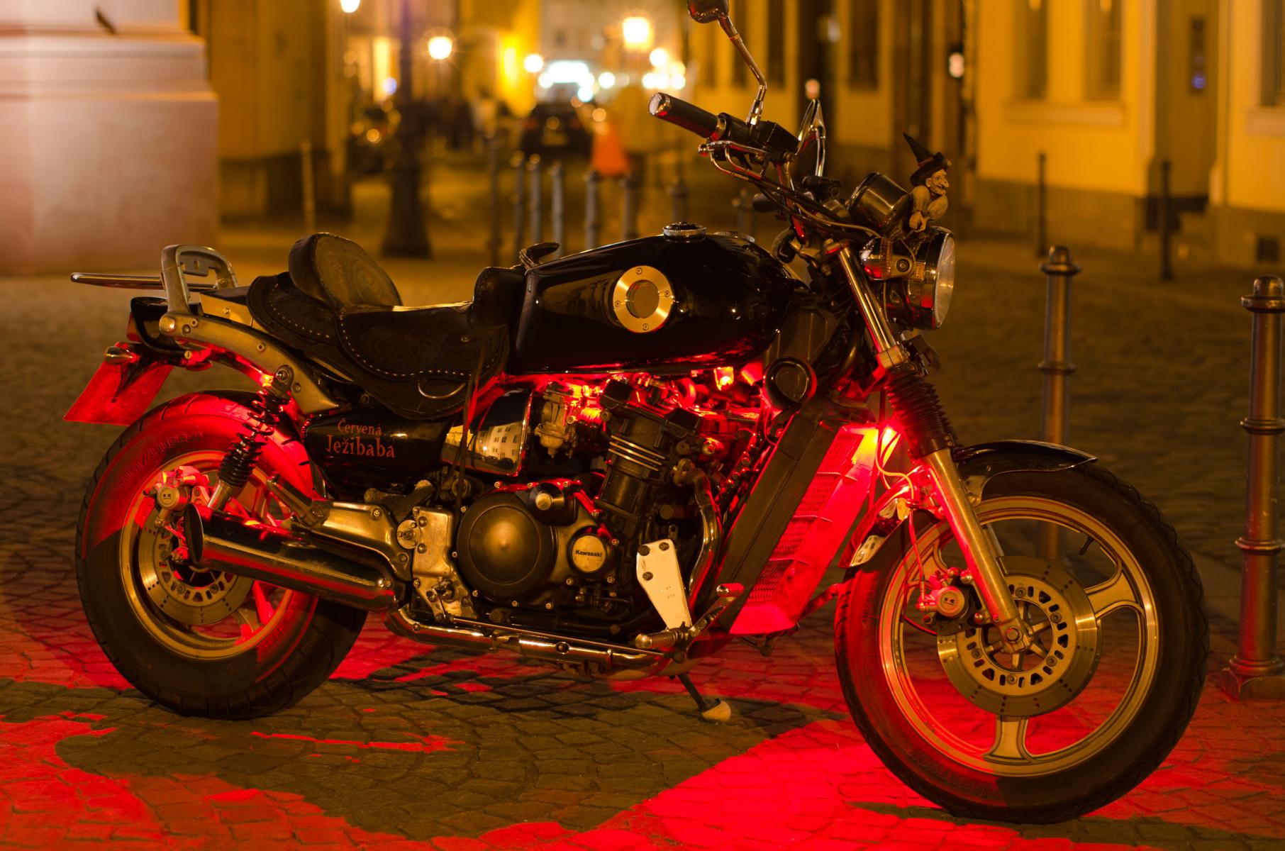 Abgesehen von der roten Beleuchtung (bin da durch meine Liebe zu GoldWing inspiriert worden) ist alles TÜV abgenommen. Manche Eintragung war nicht leicht wegen fehlender Papiere - aber am End hat es immer geklappt. Auf dem Bild ist es nicht sichtbar - aber der Tank ist von innen auch beleuchtet so daß man immer genau sehen kann, wieviel noch im Tank ist.
