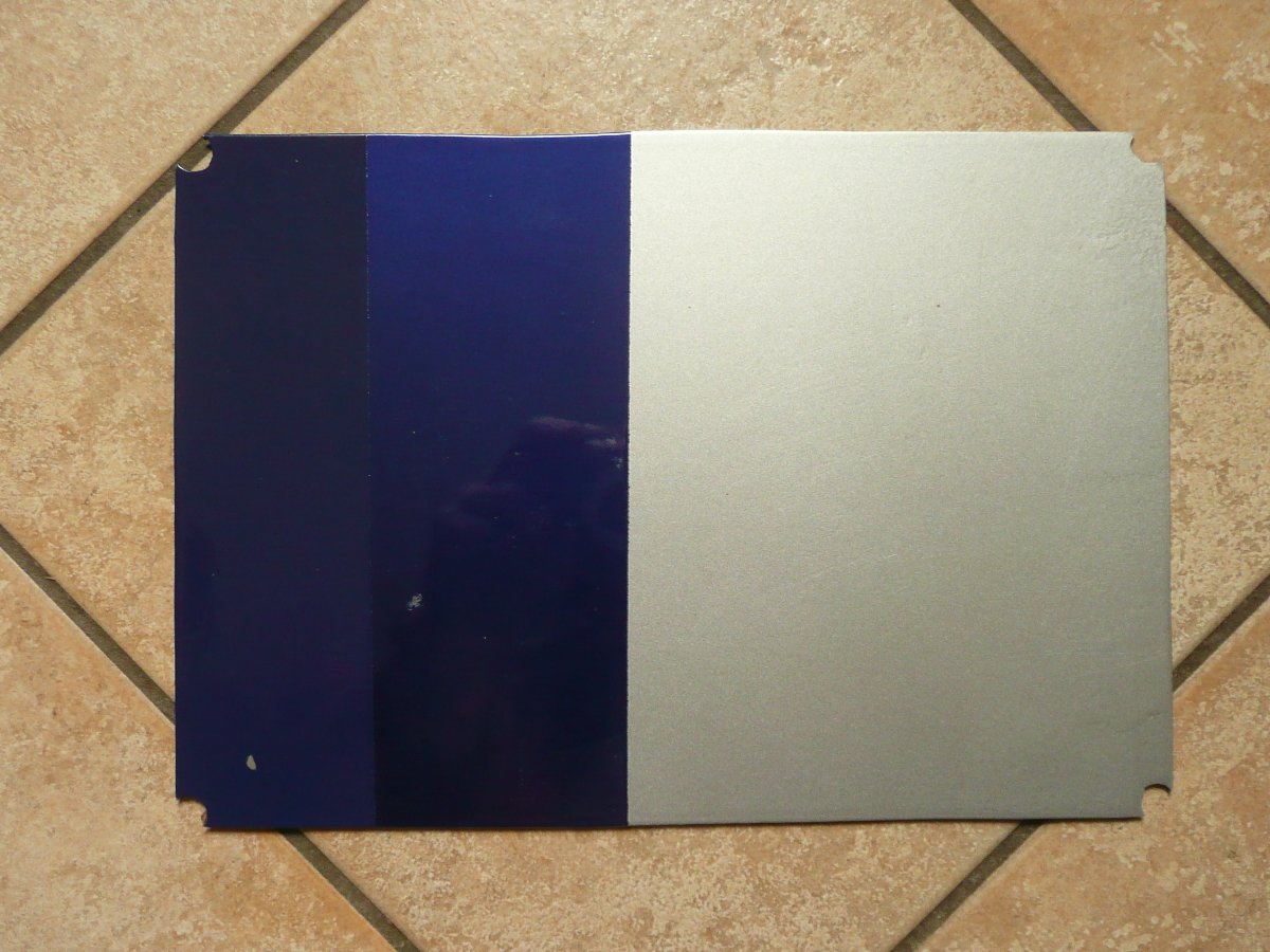 Als aus meiner R100GS die HPN wurde gefiel mir der damals neue Smart in Blau / Silber. Das mit meinem Ausführungskonzept, das mußte es sein ! Also wurde der Rahmen in RAL5022 gepulvert. Und was sagte mein genialer Lackierer ? "RAL5022 hat einen Rotstich. Das paßt nicht zum Blau des Smart". Und so lackierte er mir eine Probe in RAL5022 (links) / Ford-Imperialblau (mitte) / MB-Brillantsilber 744: