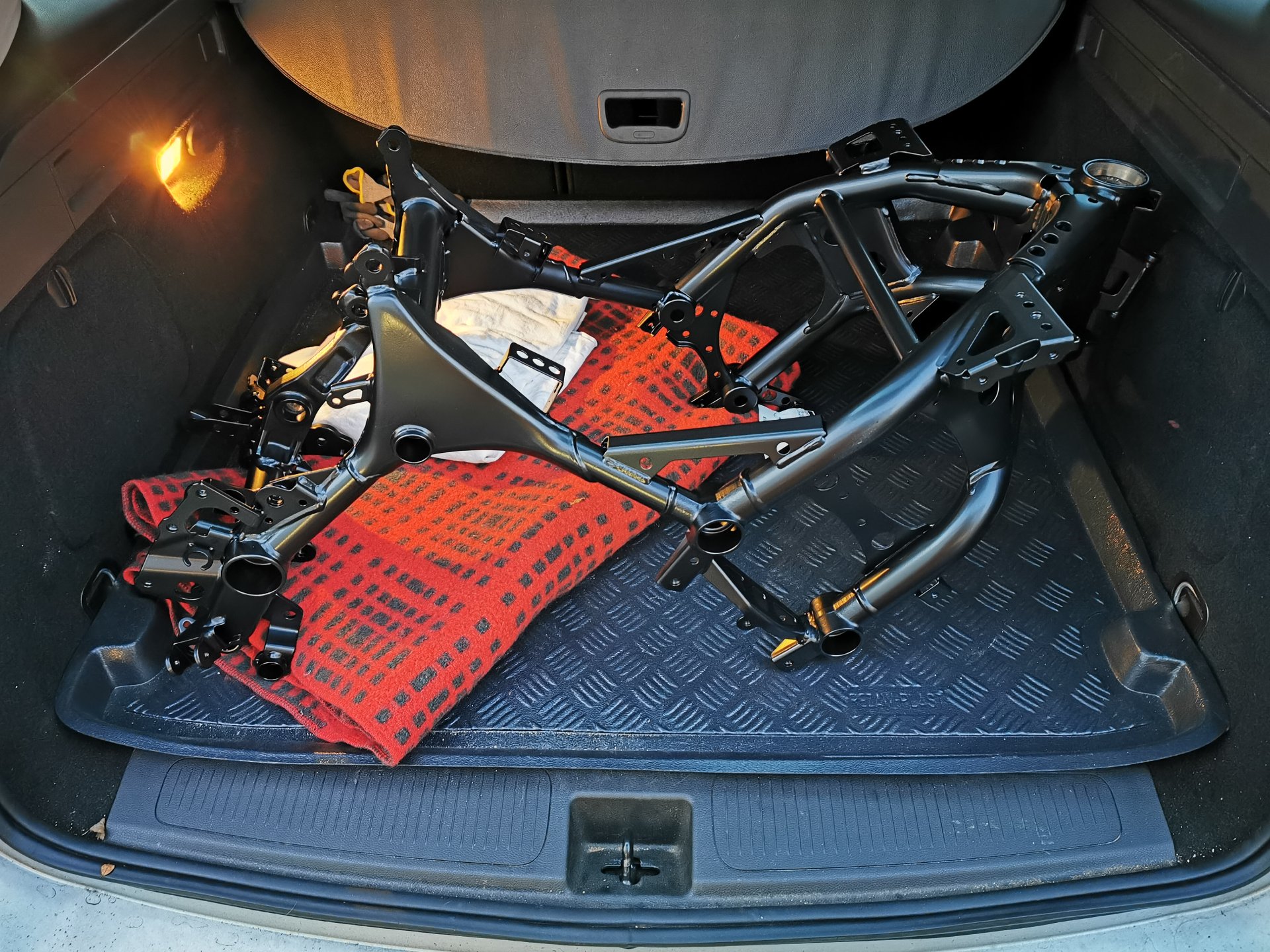 Ich gebe mal wieder ein Lebenszeichen von mir zum Thema Umbau. Der Rahmen ist vom Pulverbeschichter wieder zurück, blieb aber schwarz.