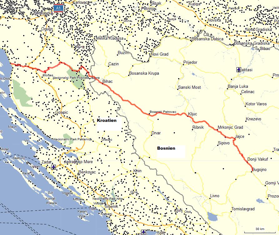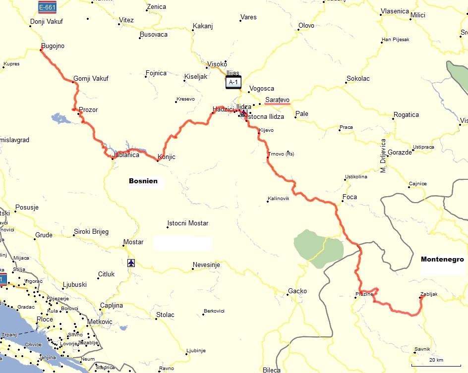 Von Sarajevo fuhren wir nach Konjic, dann am Jablanicko Stausee entlang über einen weiteren Pass nach Gornji Vakuf. Wir folgten der M-16.2 bis Bugojno, wo wir für 20,00 EUR in einer Pension übernachteten.