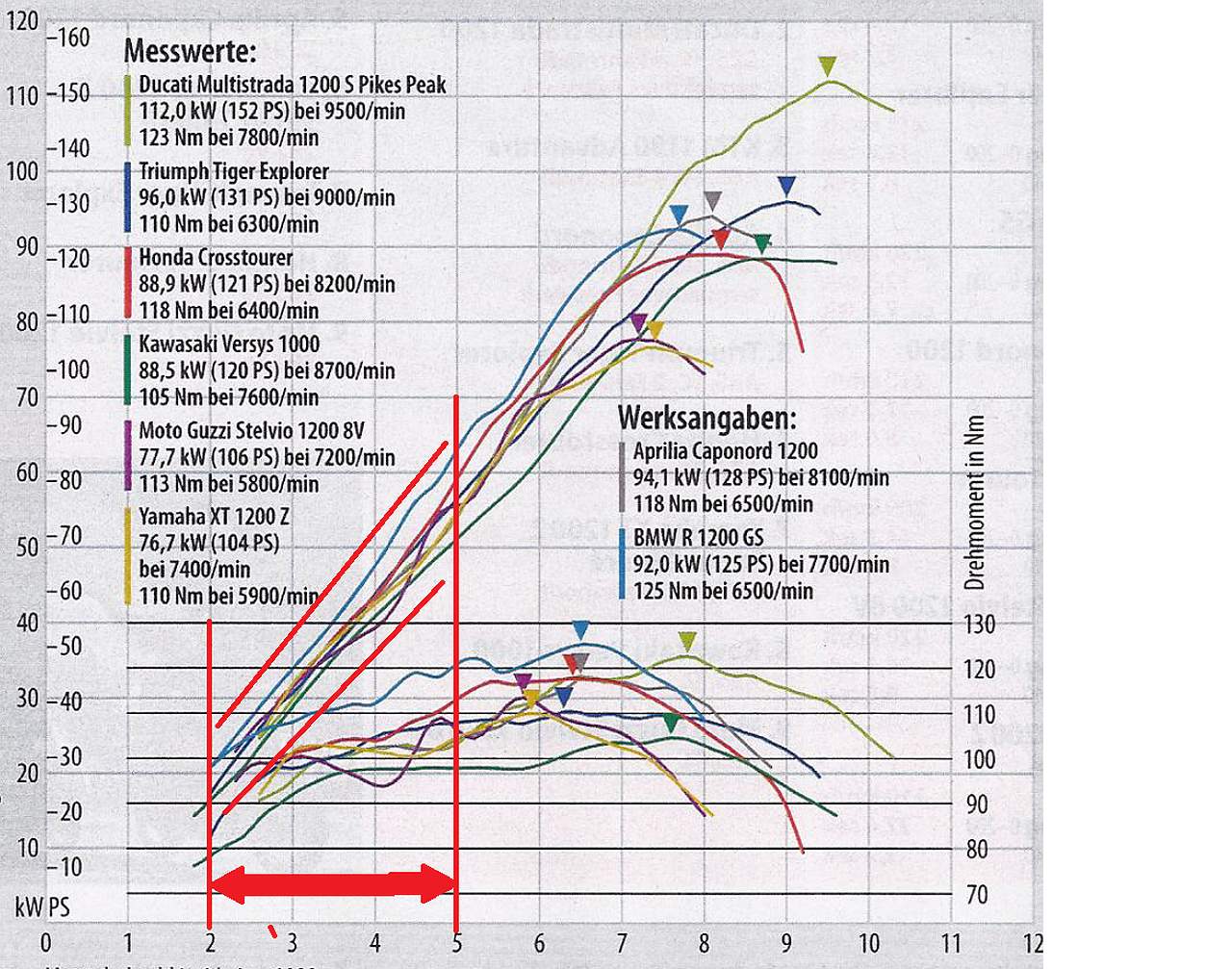 Wenn wir heute über Leistung sprechen ist ein Blick auf die Leistungs- und Drehmomentkurve der aktuellen Reiseenduros nicht verkehrt. Nehme ich den Drehzahlbereich, den ich zu 99% einer Tour benutze, dann sind die Leistung der Maschinen fast identisch. Eine 152PS Multistrada leistet bei 4.000U/min genau so viel, wie eine :xt12: oder eine Explorer oder eine Crosstourer (siehe Grafik - die Herstellerangaben zweier Hersteller lasse ich außen vor). Auch der Drehmomentverlauf in diesem Bereich ist fast gleich. Erst ab 6.000U/min ändert sich das Bild. Aber seien wir doch mal ehrlich, wie oft fahren wir denn in diesem Drehzahlbereich.