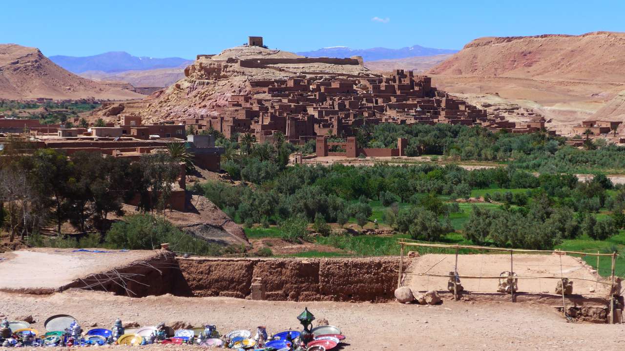 Kurz vor unserem Ziel, dem Ort Quarzazate bogen wir noch nach Aït-Ben-Haddou ab. Der Ort, heute Freilichtmuseen war Drehort des Films „Jesus von Nazareth“. Bei 34 Grad im Schatten verzichtete ich auf eine Besichtigung, wie auch alle anderen, und verbrauchte die Zeit der Pause in einer schattigen Kneipe.