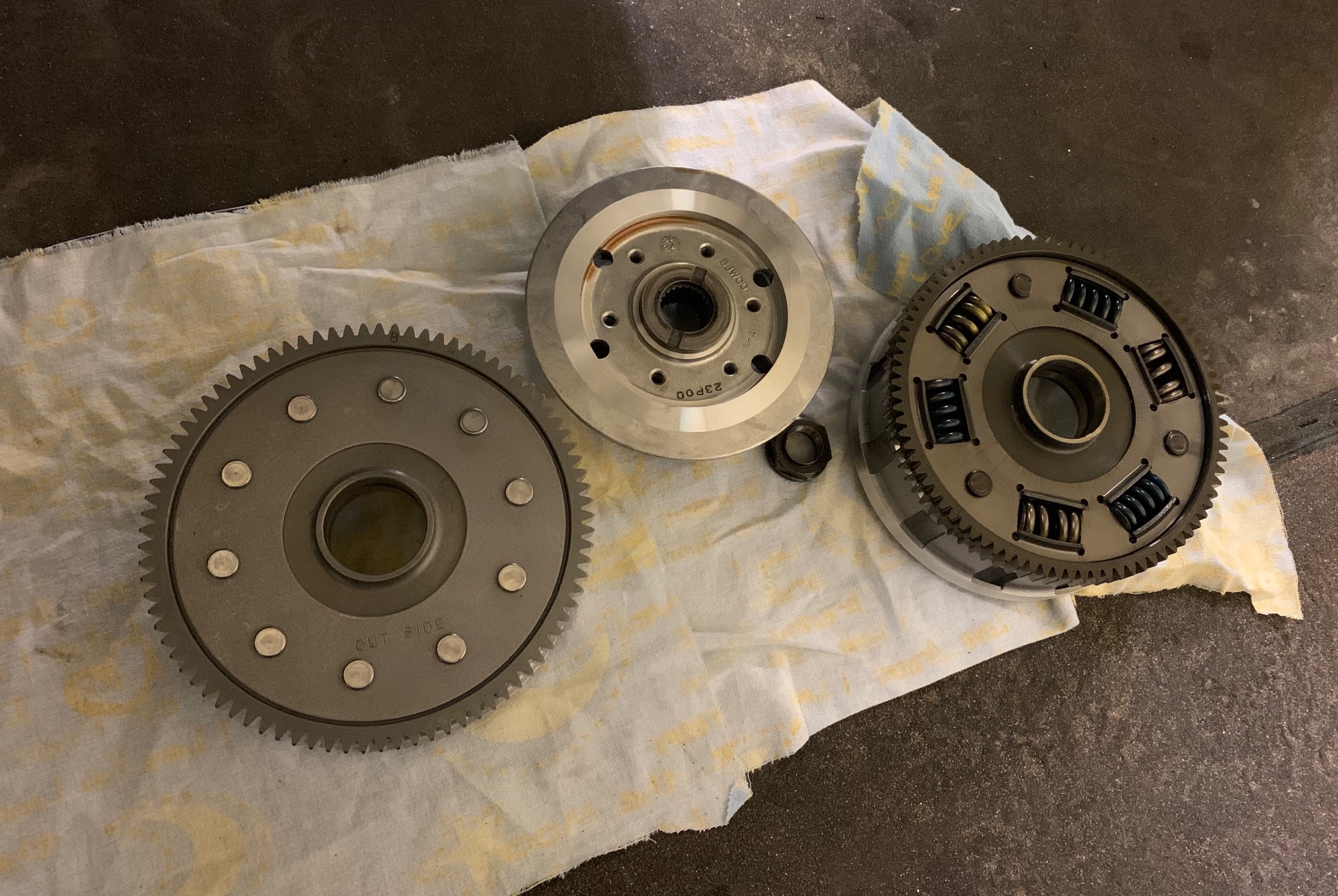 Wo das Öl gerade draußen ist, könnte ich den rasselnden DP01 Kupplungskorb mal gegen den Neuen der im Keller schlummert, tauschen.