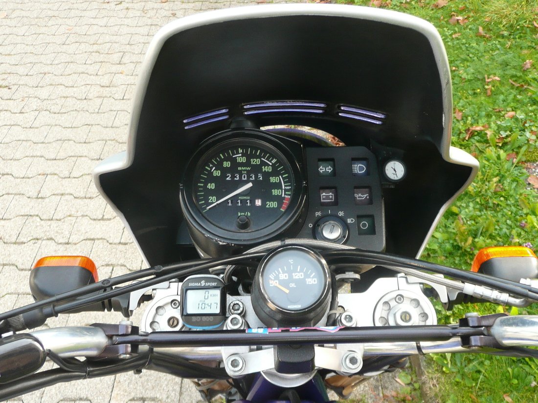 An der R100GS war serienmäßig ein Ölkühler angebaut, über dem rechten Zylinder, gedacht für Autobahnfahrt bei hohen Außentemperaturen: Es war kein Thermostat dran. An meine Maschine hatte ich ein Ölthermometer angebaut, Fühler hinten in der Ölwanne, also direttissimo. Daher weiß ich, daß das Öl erstens nur langsam warm wurde und zweitens wenn es endlich warm war von einer nassen Straße nach 1 km wieder auf unter 50° rutschte. Also