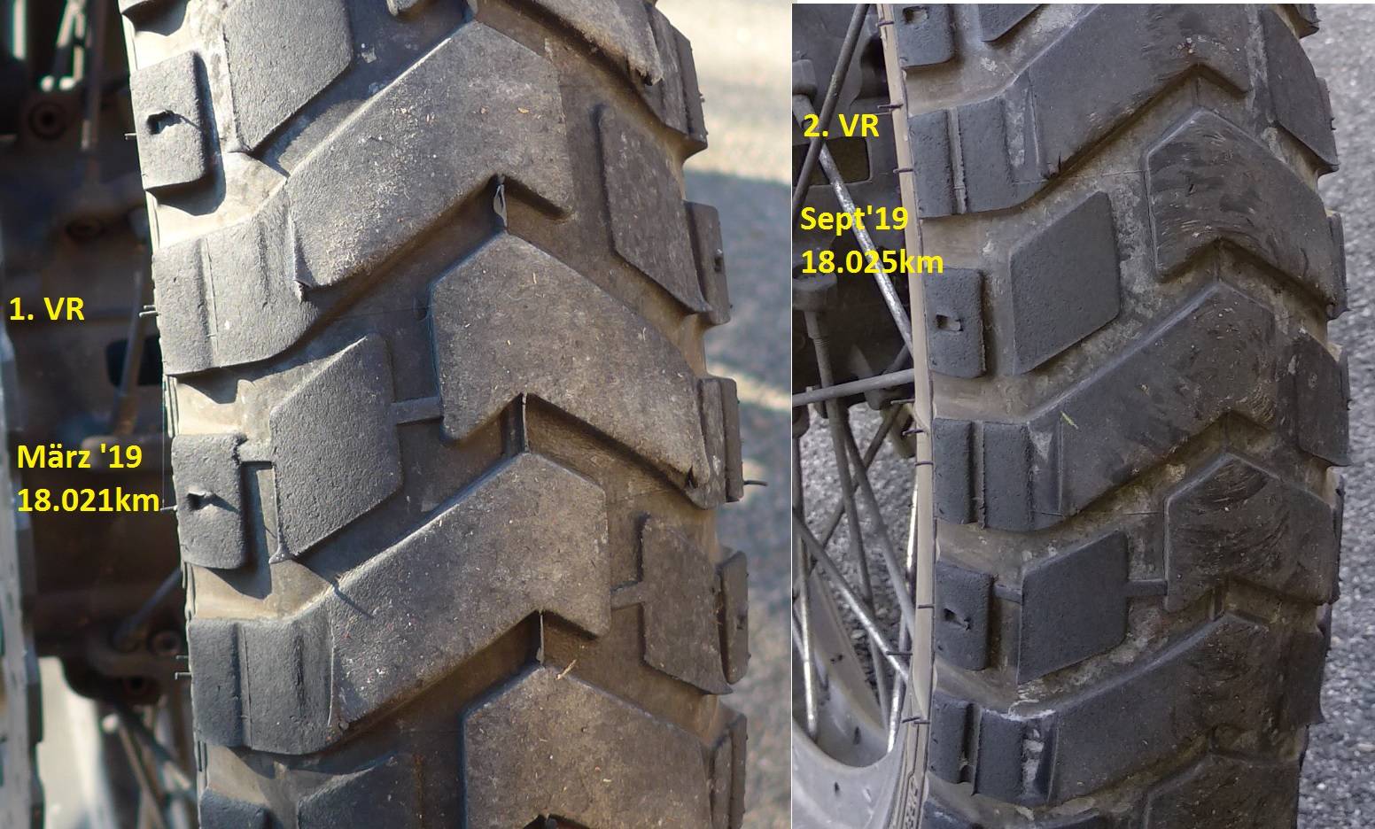 Nachdem jetzt auch der 2. Vorderreifen seine Ende gefunden hat, hier nochmal ein Bild von beiden Vorderreifen nach Ende der Lebensdauer (diesmal nicht auf dem Kopfstehend).