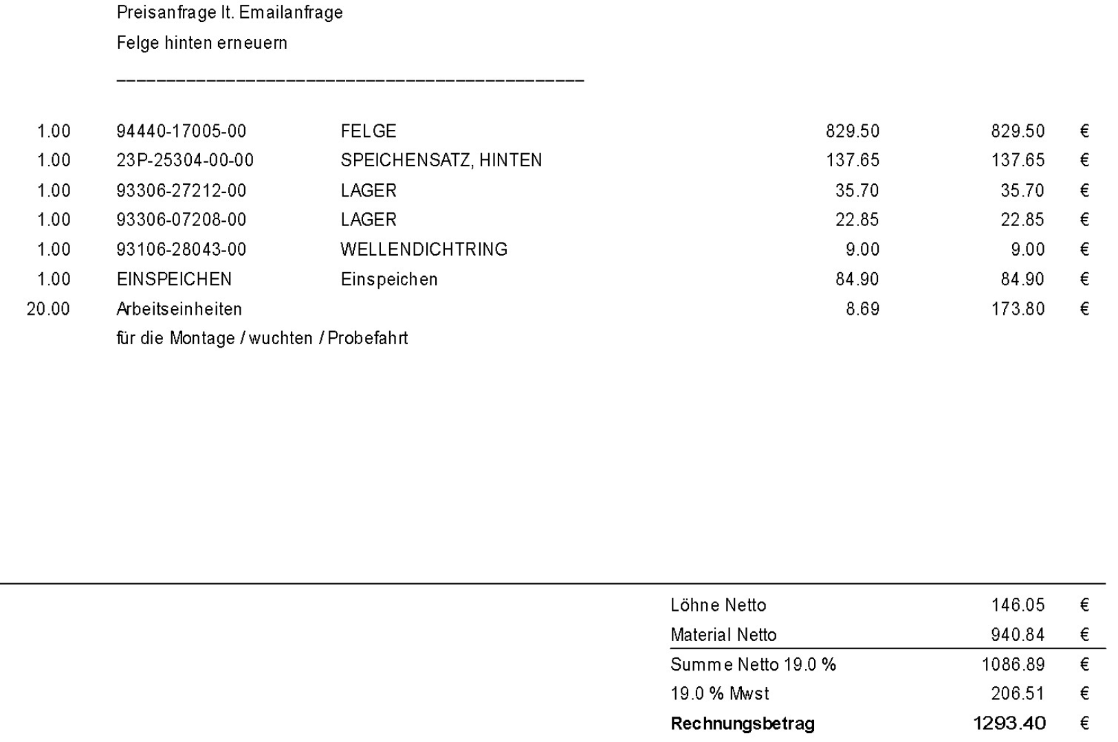 Da kam gerade der Kostenvoranschlag: knapp 1300€ inkl. Arbeitslohn.
