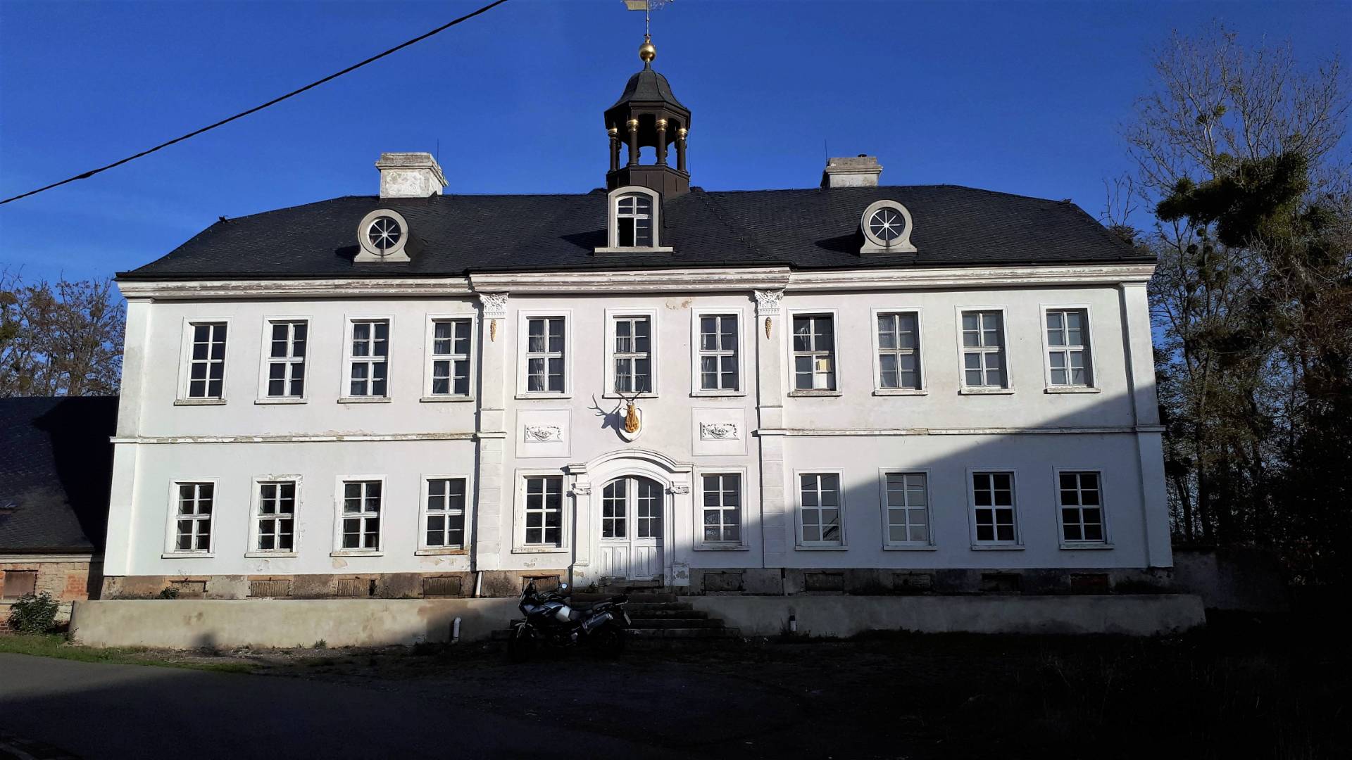 Die Sonne lässt das etwas desolate Schloss (Voigsthain) erstrahlen