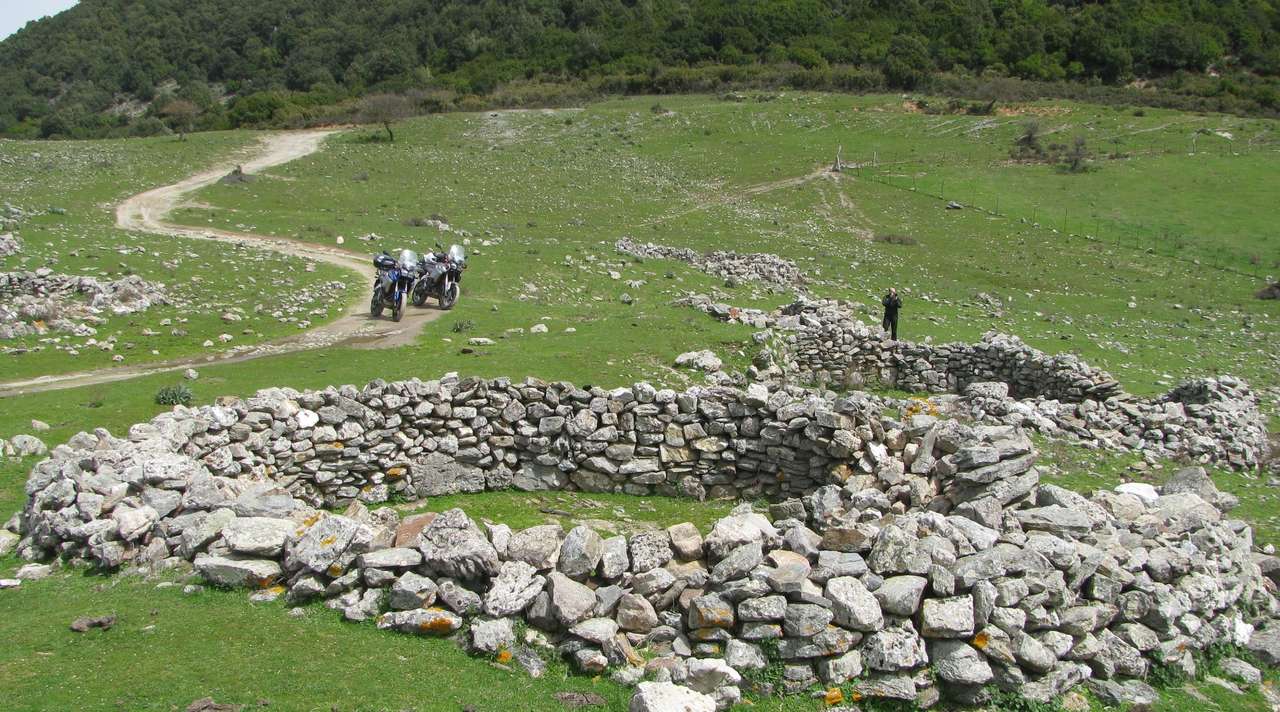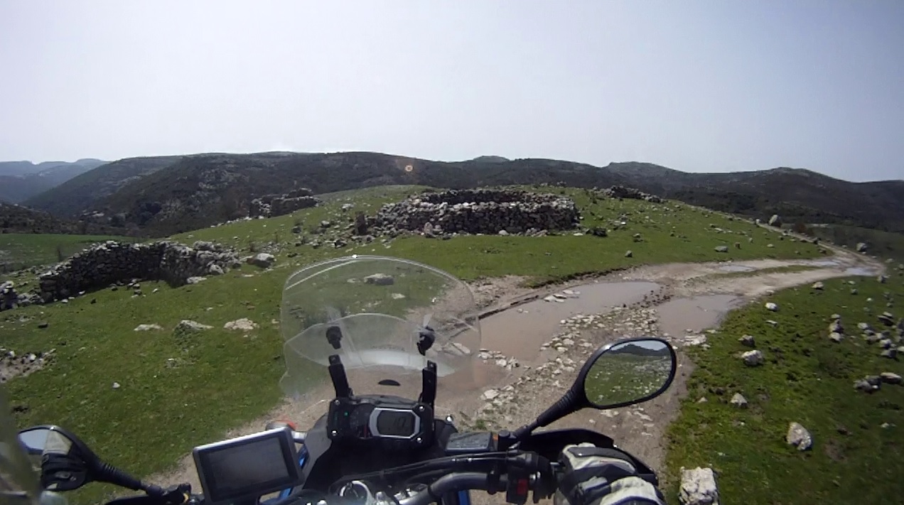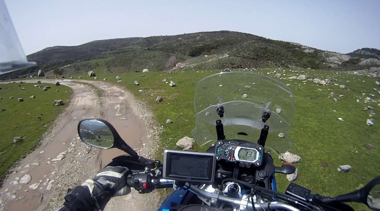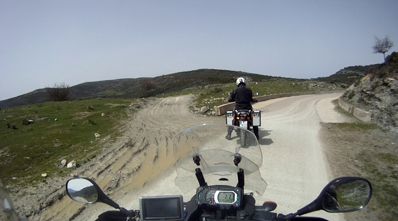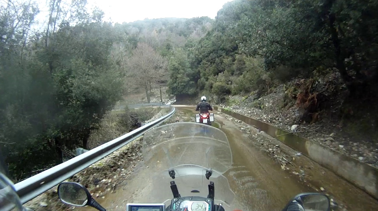 Vor Aritzo wechselten wir auf eine kleine Passtraße auf der sich eine Baustelle befand. Wir durchfuhren die Baustelle zunächst auf normalem Schotter, wenig später wurde aus dem Schotter Lehm. Die LKWs hatte in dem Lehm ihre tiefen Spuren hinterlassen. Das Fahren war nur in deren Spuren möglich, ein Ausweichen gab es nicht. Durch die tiefen Pfützen war es angebracht mit Schwung zu fahren, schließlich konnte man nicht erahnen wie tief die Dinger waren. Nach 2km war der Spuk beende und die Straße hatte wieder einen Teerbelag. An der nächsten Kreuzung bogen wir auf eine weitere schmale Straße ab, die uns nach Tonara führen sollte. Diese Straße wurde an vielen Stellen von Wasser überspült und im Wasser hatte sich schon ein Algenbelag, der den Grip von Schnee hatte, gebildet. Langsam eierten wir nach Desulo, um dann die SP7 und SS295 nach Tonara zu fahren.