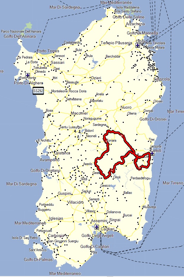 Wir folgten der SS11 und SS125 bis Tortolì. Über die SS198 gelangten wir kurvenreich nach Lanusei. Der Rückweg zum Hotel sollte wieder über den Passo Correboi erfolgen. Diesmal funktionierte der Ignor-Mode und wir übersahen das Gesperrt-Schild. Ein weiterer Kuhfladen-Tango folgte und wir gelangten beschwingt nach Fonni und weiter zum Hotel.