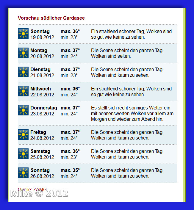 Soo nachdem der große Trubel an Gardasee hoffentlich vorbei ist werde ich am Montag nach einer längeren Zwangspause ( meine Frau hat sich Bein Bootfahren den 1 sten Lendenwirbel gebrochen ) mal zum Lago fahren. Wetter ist ja noch ganz GUT.