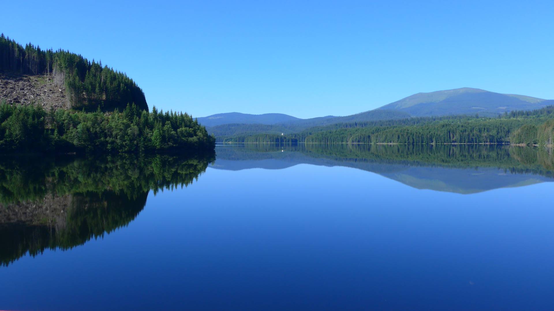 Einsam und verlassen folgten wir der Straße. Verfahren konnten wir uns nicht, es gab keine Abbiegemöglichkeit und auch keine Orte auf den nächsten 58km. Wir fuhren immer im Wald und trafen erst auf den Tau-Bistra Stausee und dann auf den traumhaften Oasa Mica Stausee. Der Straßenbelag wechselt von nah-das-geht-schon bis frisch geteert. Schlaglöcher und Betonplatten wurden uns größtenteils erspart. Dafür hatte sie eine kurze Schotterpassage parat.