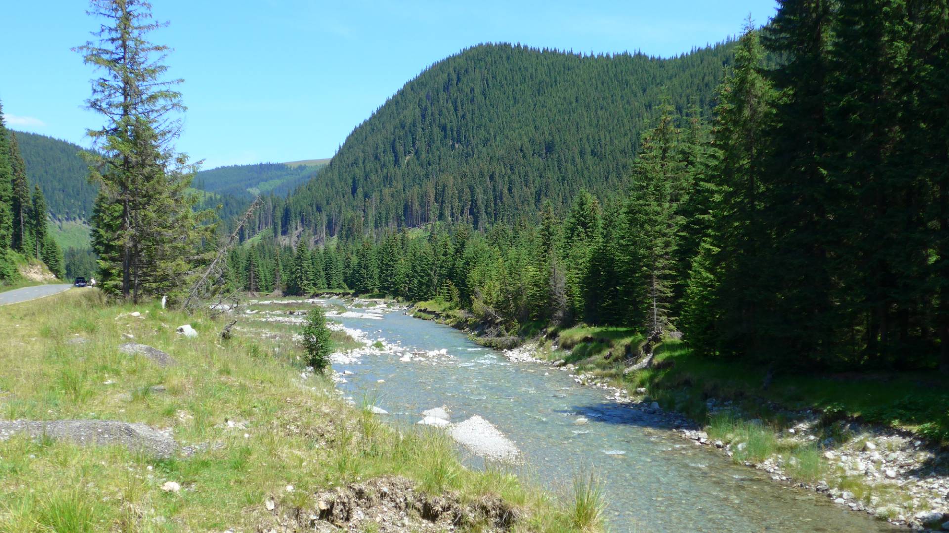 An der Kreuzung fuhren wir nach rechts, 1km auf der DN7A, und folgten dann weiter der Transalpina durch das Tal der Lotru. Die Landschaft erinnerte mich an Kanada, ein Gebirgsfluss mit ausgespültem Bett, links und rechts Wiesen und an den steilen Hängen Wälder.