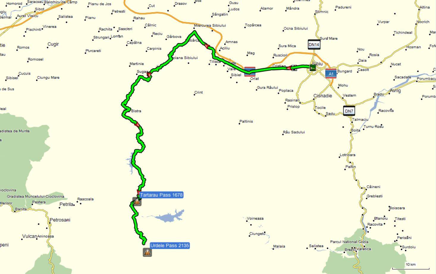 Die ersten 34km waren Stadtverkehr und anschließend wie Autobahnfahren. Die zum Teil 4-spurige DN1 führte nach Westen. Kurz vor Miercurea Sibiului bogen wir nach links in die DJ106g ein. Dieses kurvenreiche schmale Sträßchen stieg über 20km von 330m auf 985m an.