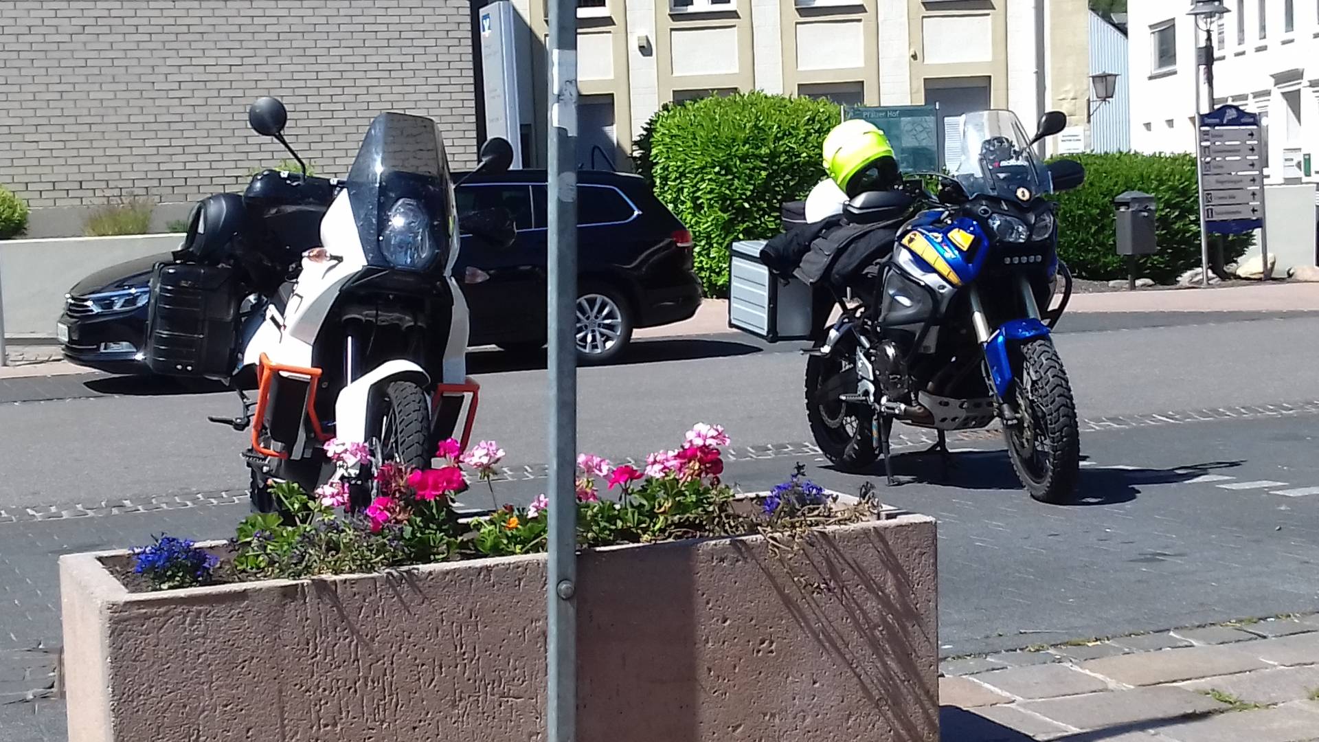 welche bei mir die Verbreitung von Altrider unter dem Seitenständer hat, vor dem Hotel abstellen wollen. Mit der Verbreiterung gemerkt die steht garnet gut und sehr aufrecht, also Hauptständer angesetzt und in dem Moment wo Ich ziehen wollte kippt Sie auf die andere Seite weg.