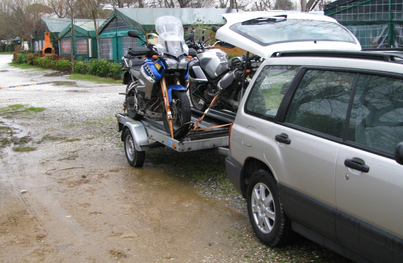 Um 8.00 Uhr sollte die Fähre in Livorno sein. Bereits um 7.55 Uhr hatten wir die Fähre verlassen und machten uns auf den Weg zu unserem Subaru samt Hänger. Italien verabschiedete die XTs noch mal mit einem heftigen Schauer. Um 8.05 Uhr kamen wir nass am Campingplatz an. Der Eingang war versperrt, Schranke und Zaum waren zu und keine Sau weit und breit. Ohne zu zögern fuhr ich durch die offenen Ausfahrt entgegen der Einbahnstraße in den Campingplatz ein.