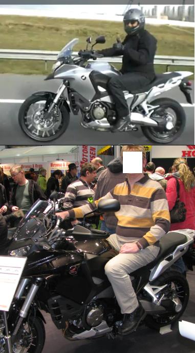 Ich will mal hoffen, dass der Typ auf dem Crosstourer 2,10m groß ist und deshalb da drauf hockt wie der Affe auf dem Schleifstein. Habt Ihr gesehen, wie der die Beine anzieht? (=Knie stark abgewinkelt) Ich fürchte, das ist die gleiche merkwürdige Sitzhaltung wie auf dem kleinen Crossrunner - unten Sporttourer, oben Reiseenduro. Das passt nicht.