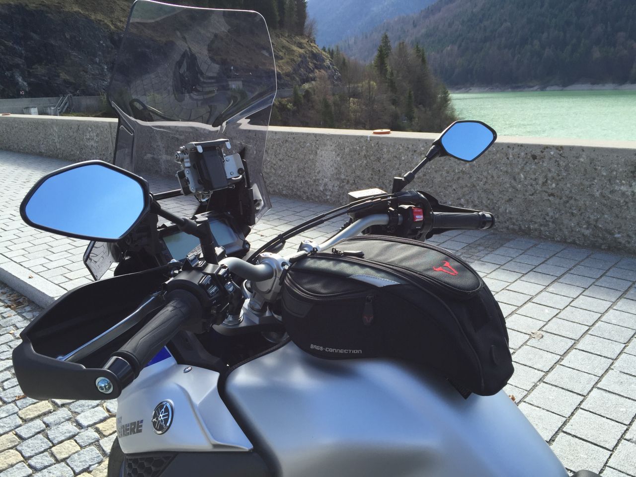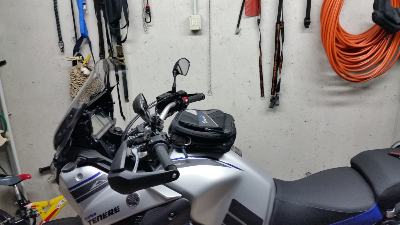 Von meinen früheren Motorrädern habe ich die Tankrucksäcke (alle SW-Motech mit dem alten Quick-Lock-System (nicht EVO)) aufgehoben. Derzeit verwende ich den kleinen "Engage" mit 7 ltr Inhalt. Für die kleine Runde langt er, um Geldbörse, Handy, ABEs und Handy unterzubringen. Bei größerer Tour habe ich noch den "Engage XL" mit einem Kartenfach zum Anschnallen (vorne 2 Ösen zum Einklinken und zum Fahrer hin ein Klett).
