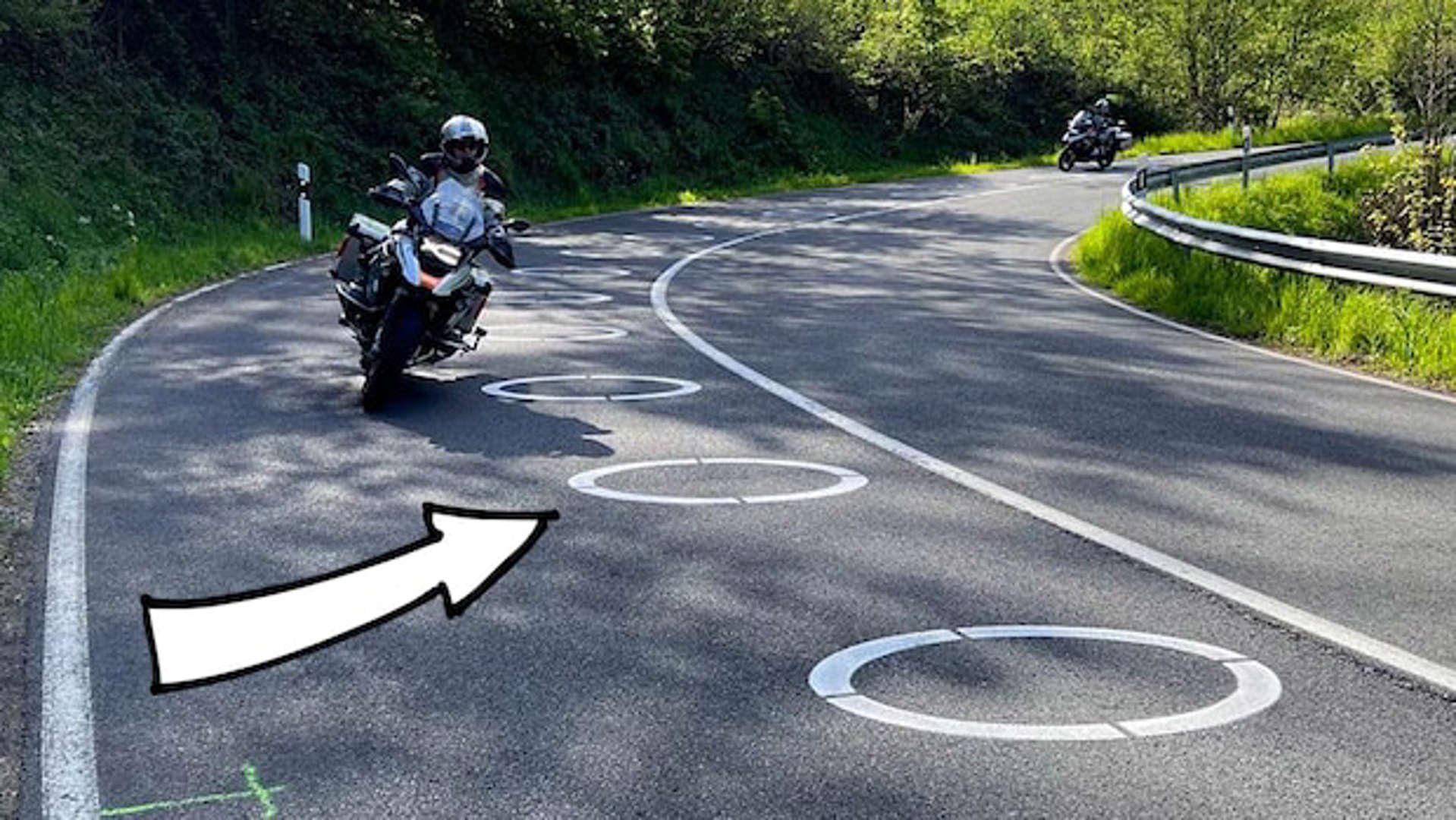 Die Markierungen sollen verhindern, dass Motorradfahrer in Linkskurven die Kurve schneiden.