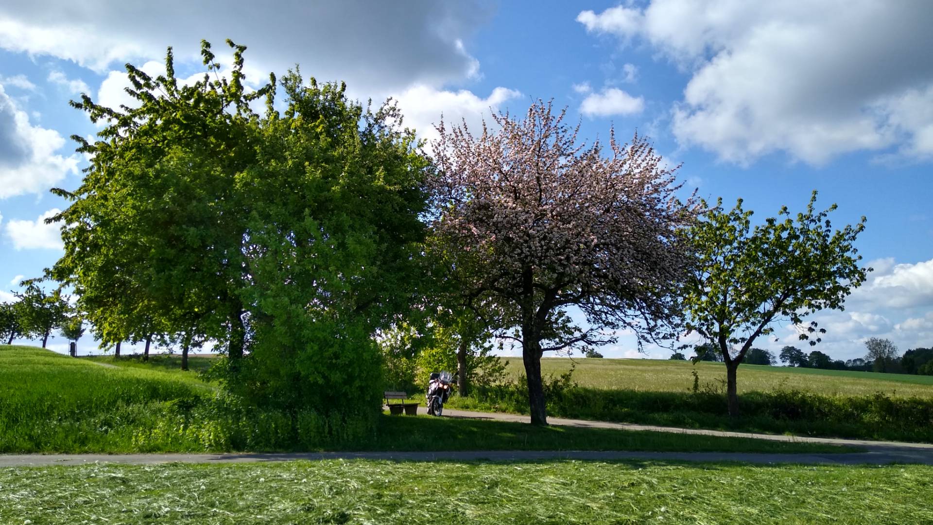 Heute ist es schon bedeutend wolkiger als gestern, dennoch ein Bänkchen unterm Lindenbaum gefunden auf der Bäckerrunde, die mal wieder ausgedehnter verlief als geplant.