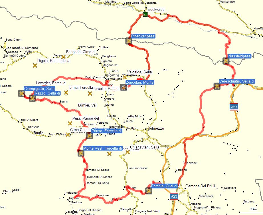 Plöckenpass, Monte Zoncolan, Sella Ciampigotto, Sella di Razzo, Forcella di Priuso, Monte Rest, Sella di Cereschiatis, Nassfeldpass