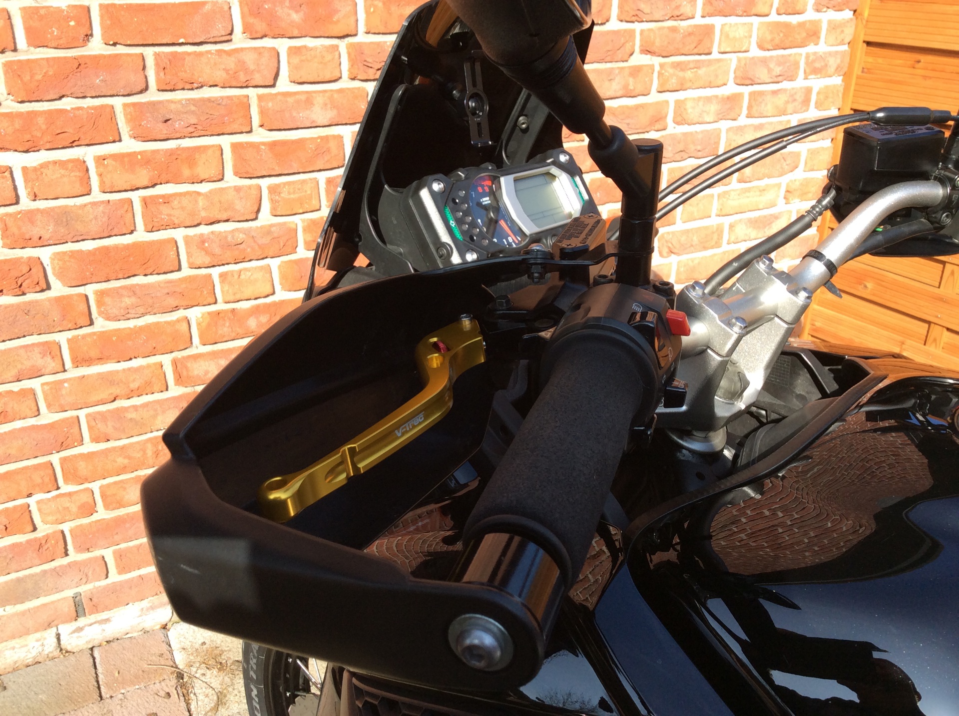 Zwischenzeitlich sind meine V-Trecs auch montiert, was tatsächlich kein großer Aufwand war. Dabei stellte ich fest, dass der Kupplungshebel, wenn man ihn ganz anzieht, gegen die linke Schaltereinheit stößt, da er viel stärker gekröpft ist als der Normalhebel. Auf Dauer sollte das für die Schaltereinheit nicht gut sein. Ich glaube nicht, dass ich da was falsch montiert habe. Das passiert auch, wenn der Hebel weit vom Lenker entfernt eingestellt ist, was ich aber nicht möchte, dann hätte ich auch die alten Hebel behalten können. Nicht getestet habe ich, ob man den Hebel im Normalbetrieb auch tatsächlich ganz durchzieht, dazu war's dann doch zu kalt, eisig und salzig.