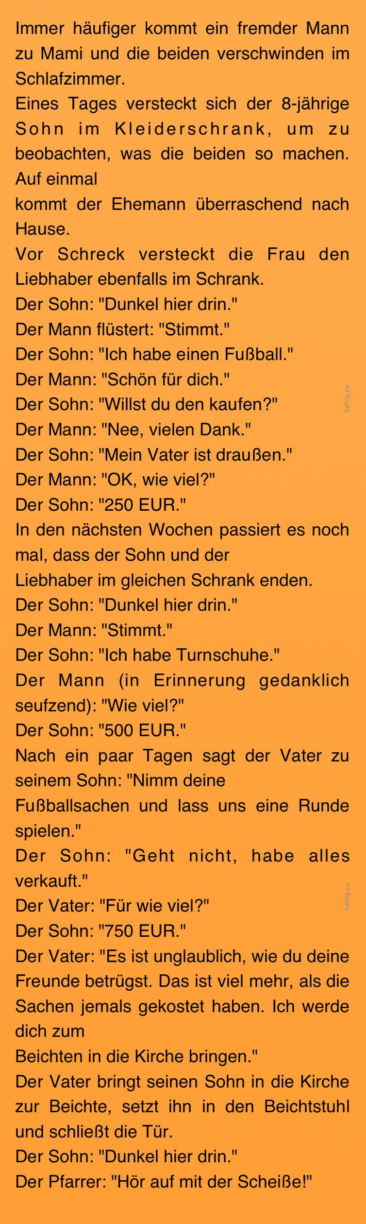 Der Therapeut fragt : " Was kann ich für sie tun? " Der Mann antwortet: "Würden sie uns beim Sex zuschauen? " Der Therapeut ist erstaunt über dieses Anliegen, stimmt aber zu. Als das Paar fertig ist, sagt der Therapeut :"Es tut mir leid, aber ich finde nichts aussergewöhnliches an ihrer Art Sex zu haben." und verlangt 80 € für die Sitzung. Im folgenden Quartal wiederholt sich das Ganze: 2× in der Woche kommt das Paar, hat Sex, bezahlt 80 € und geht wieder. Nach einigen Wochen fragt der Therapeut:"Entschuldigen sie die Frage, aber was genau versuchen sie eigentlich heraus zu finden? "