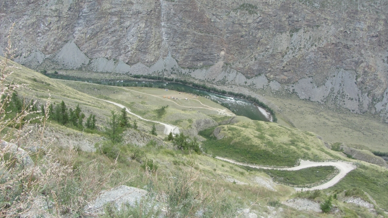 15. Juli. Eigentlich wollten wir heute ein kleines bisschen fahren, 20 km die Straße rauf gibt es eine kleine Stichstraße, die anscheinend zum Fuß der Berge führt und für die augenscheinlich kein Propusk notwendig ist. Es gab wieder das klassische europäische Frühstück, natürlich selbst gemacht. Weil ich noch mit meiner Frau telefonieren wollte legten wir den Start auf kurz nach Zehn.