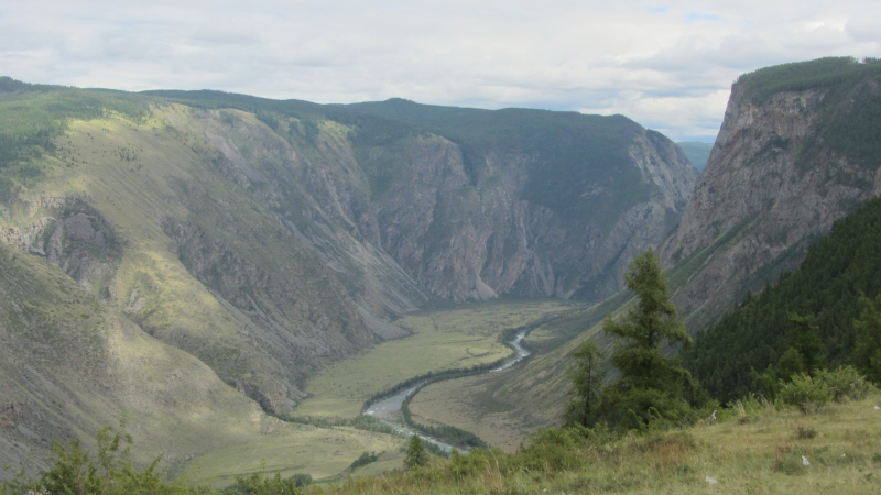 13. Juli. Nach unserem gewohnten Frühstück, Kaffee, Kekse und eine Zigarette ging es los. Erst einmal Tanken, Einkaufen und den Bankomat ausräumen, dann auf die Straße nach Kosch Agach. Überwiegend in gutem Zustand und mal wieder schöne Kurven durch eine wunderschöne Landschaft. Dabei wurde es langsam etwas karger und kurz vor Kosh Agach öffnete sich ein weites Tal, das schon ein bisschen nach Mongolei aussah.