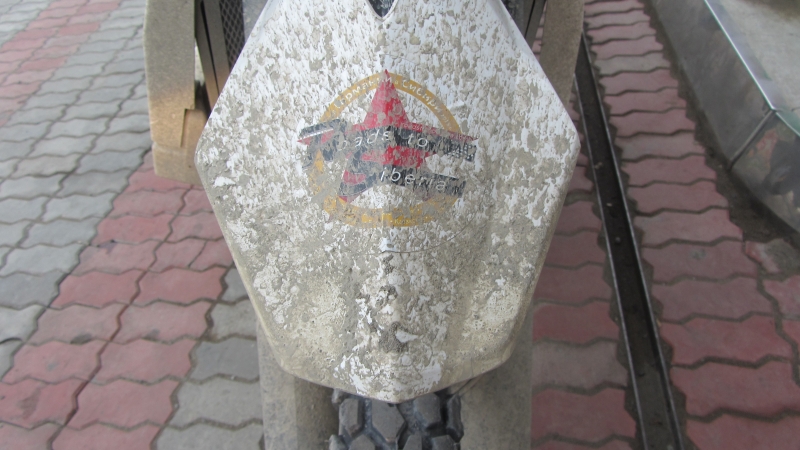 Ein richtiges Leck konnte ich nicht feststellen, aber die Schlauchschelle ließ sich ein bisschen nachziehen. Dem Luftfilter konnte ich wieder reichlich Staub ausklopfen, Bremsbeläge waren noch okay, also Tank wieder drauf und gut. Dann meinem Kettenwerkzeug ging der Wechsel bei Thom ebenfalls recht zügig von statten, so dass wir nach 2 Stunden damit durch waren. Nach einer Dusche gings dann in ein Kaffee, um etwas zu essen. Es gab eine Art russische Variante von Bauernfrühstück, Kartoffelschnitzel, Hackfleisch, Tomaten und Käse mit Ei, das ganze heiß gemacht. Es schmeckte wirklich lecker.