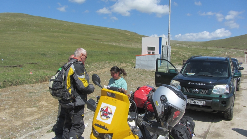 Also weiter zum russischen Grenzposten, natürlich bis ganz vorne an die Schlange. Was uns niemand krumm nimmt. Kurz Pässe vorgezeigt und schon dürfen wir in den Abfertigungsbereich. Entgegen Thom Erinnerung ist dieser Grenzübergang neu organisiert und so kommen wir recht zügig durch. Wir dürfen zwar unser Gepäck öffnen, aber wirklich gucken tut keiner. Dann zum zweiten Kontrollposten und los geht’s durch das „Niemandsland“ zum letzten russischen Posten. Dann sind wir schon mal auf mongolischem Boden. Wie gewohnt fahren wir am mongolischen Posten wieder an der Schlange entlang zur Pole-Position, doch diesmal werden wir ziemlich energisch ans Ende geschickt. Wir haben das Desinfektionsbecken übersehen. Diesmal heißt es wie alle anderen Schlange stehen!