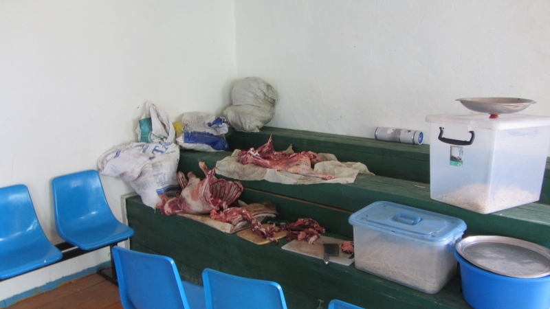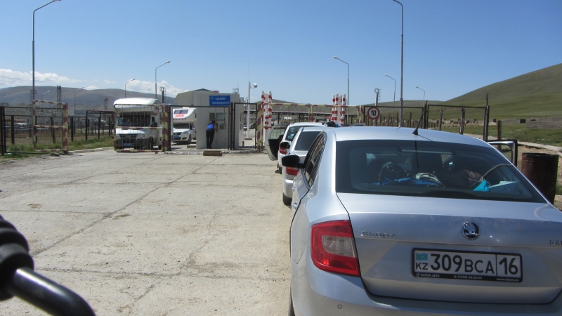 In der Tat, er öffnet das Grenztor und schickt uns zusammen mit 2 Pkw zum Abfertigungsgebäude hinunter. Dort werden wir von einem anderen Posten empfangen und lassen uns erwartungsvoll ins Gebäude führen. Doch da ist kein Mensch und so folgen wir dem Posten bis zu einer Kantine, wo er uns bedeutet, wir sollen hier warten und gerne auch etwas Essen. Das ist schon ein spezieller Service, Mittagessen in der Grenzer Kantine. Das Essen ist soweit okay, der Tee nicht mit fermentierter Milch versetzt und zum Glück für mich nur wenig wirklich fettes Fleisch. Nach dem Essen geht es wieder raus zum Warten.